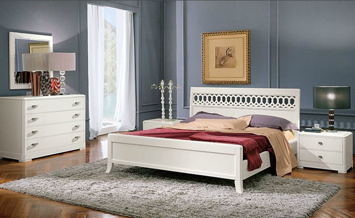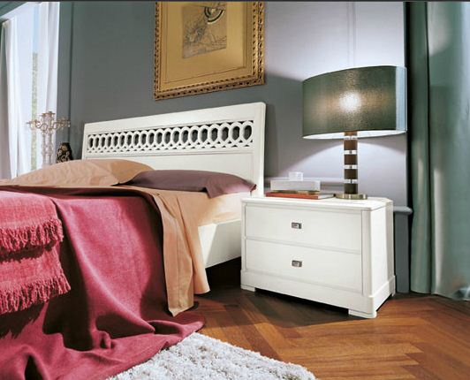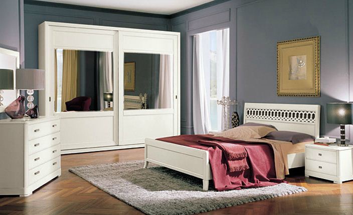 Set for bedroom Murano bianco from the Italian manufacturer Serenissima. Set consists of a double bed, bedside tables, chest of drawers, cupboards, slider mirror-fronted. Products made from solid wood, finished walnut veneer is used, the surface is covered with white lacquer. Color range is wide, it is possible to choose in the catalog of the manufacturer. Set is made in the neoclassical style. The main decor is a cross-cutting thread of the headboard that gives lightness and airiness of the structure. The perfect choice for those who appreciate quality, style and beauty.