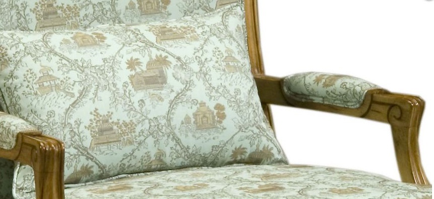 Chair Bonnie from the American manufacturer Pearson. The case is made of wood. Upholstery textile with polyurethane foam filler. The model is complemented with a decorative pillow. Frame carved handmade. Seat cushion is removable.