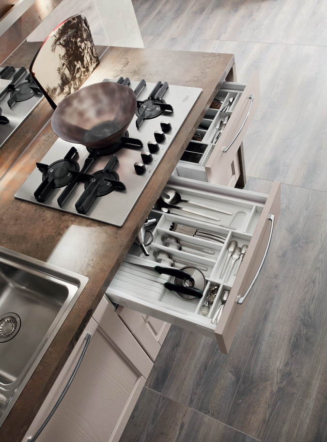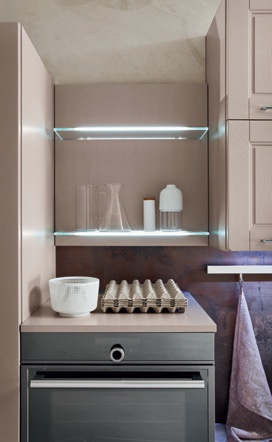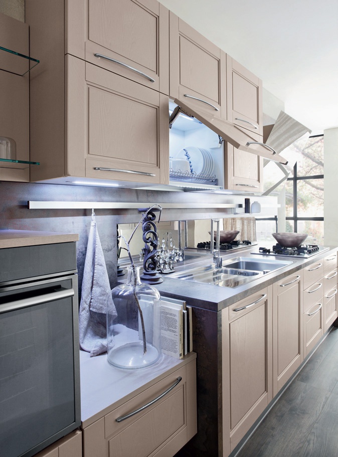Kitchen Cloe comp.2 from the Italian manufacturer Ar-Tre. The model is made of waterproof wood. Facades made of solid wood in the finishing varnish color hemp, plinth and handles are made of chrome steel. The table top is made of quartzite. The kitchen is equipped with furniture items of different heights and shapes, inner filling, glass shelves with lighting. Built-in appliances. Colors to choose from manufacturer's catalogue. Kitchen designed in modern style.