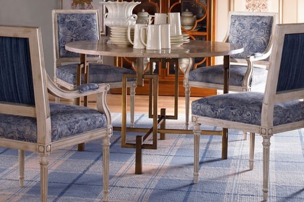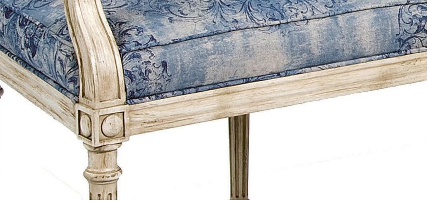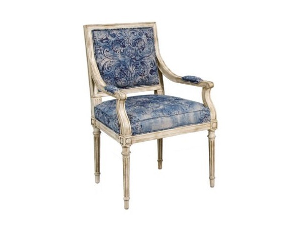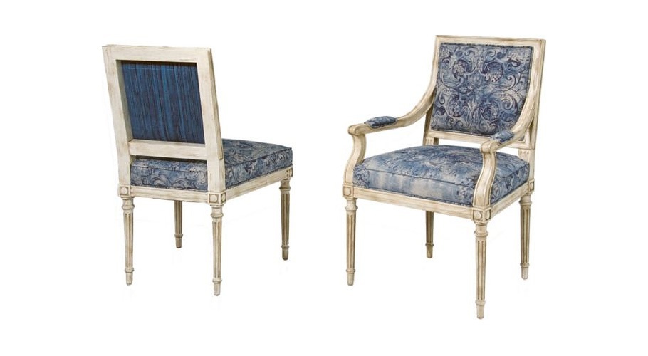 Chair Dawn from the American manufacturer Pearson. The case is made of wood. Frame carved from European beech. Carved rectangular back and classic style Louis XVI fluted legs. Finish with an aged finish effect. Upholstery textiles. Colours in stock.