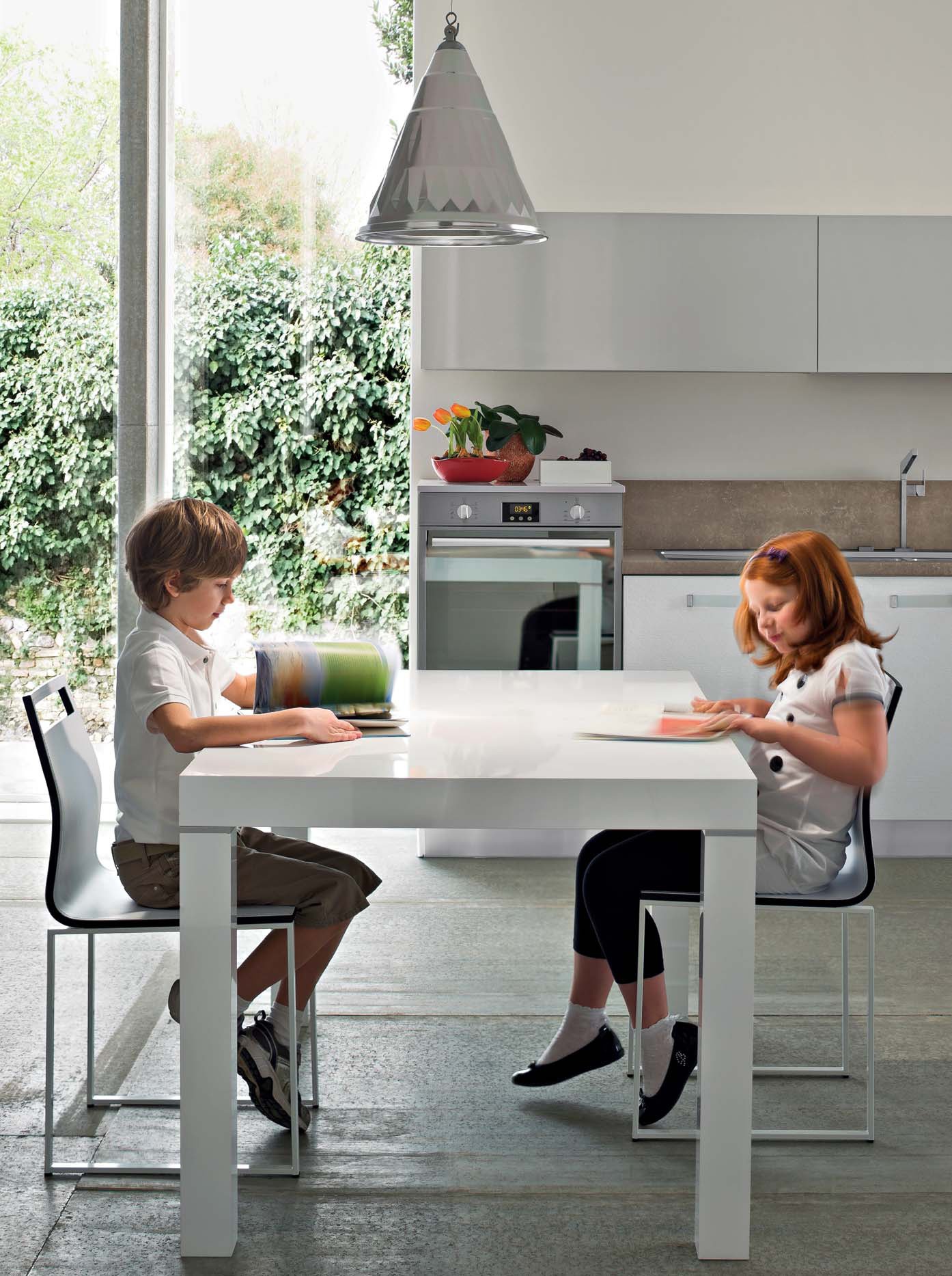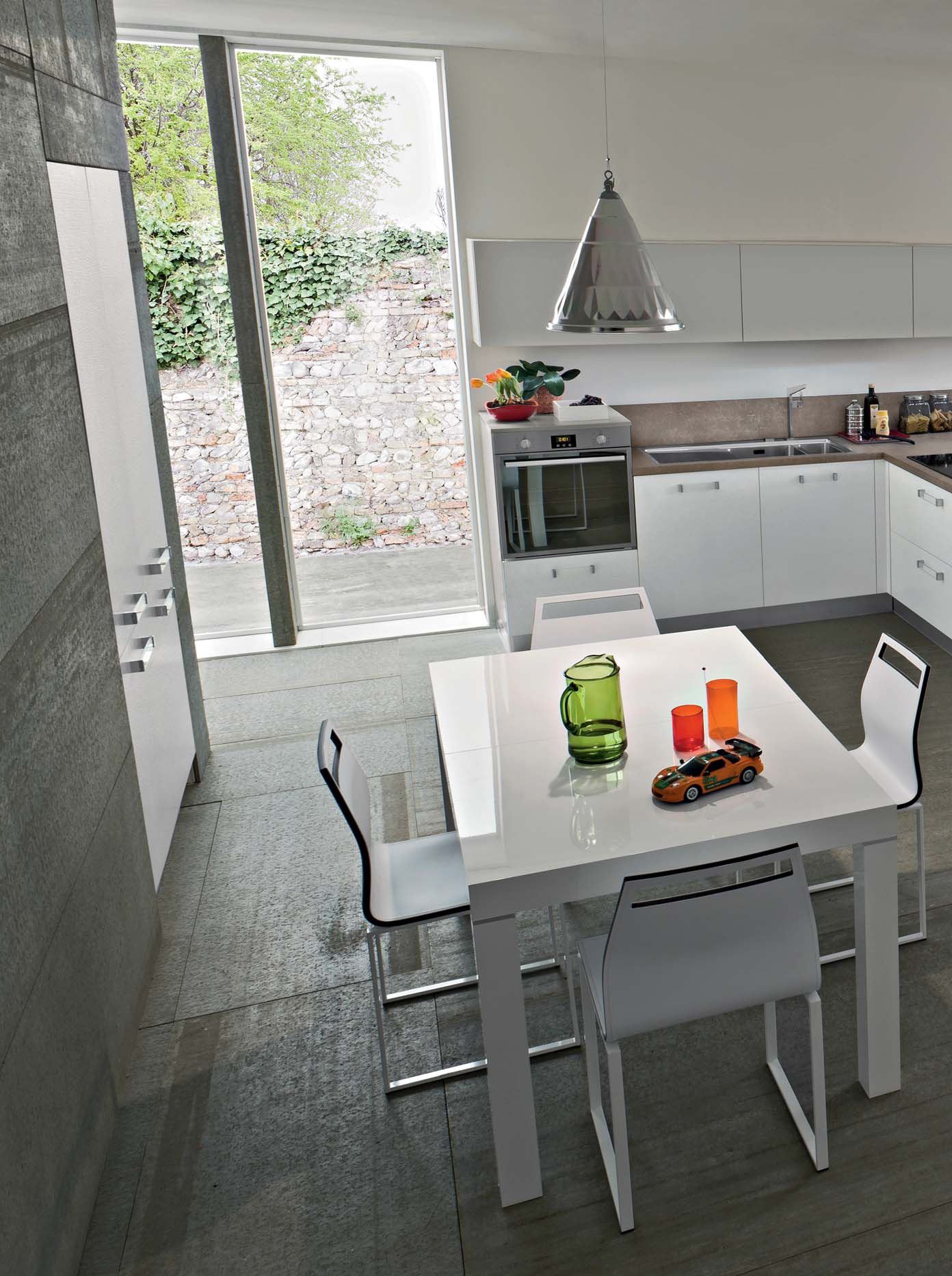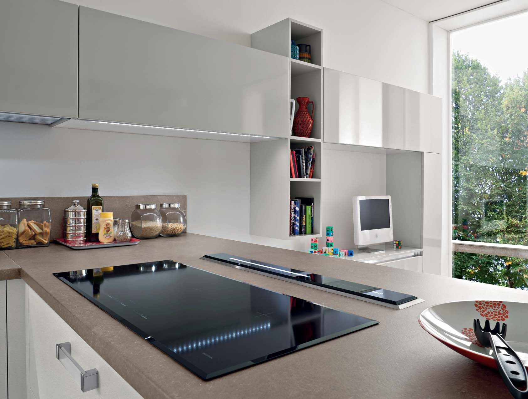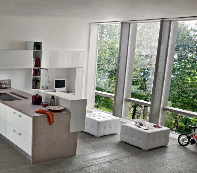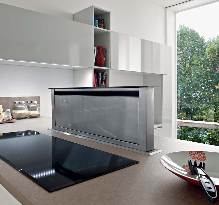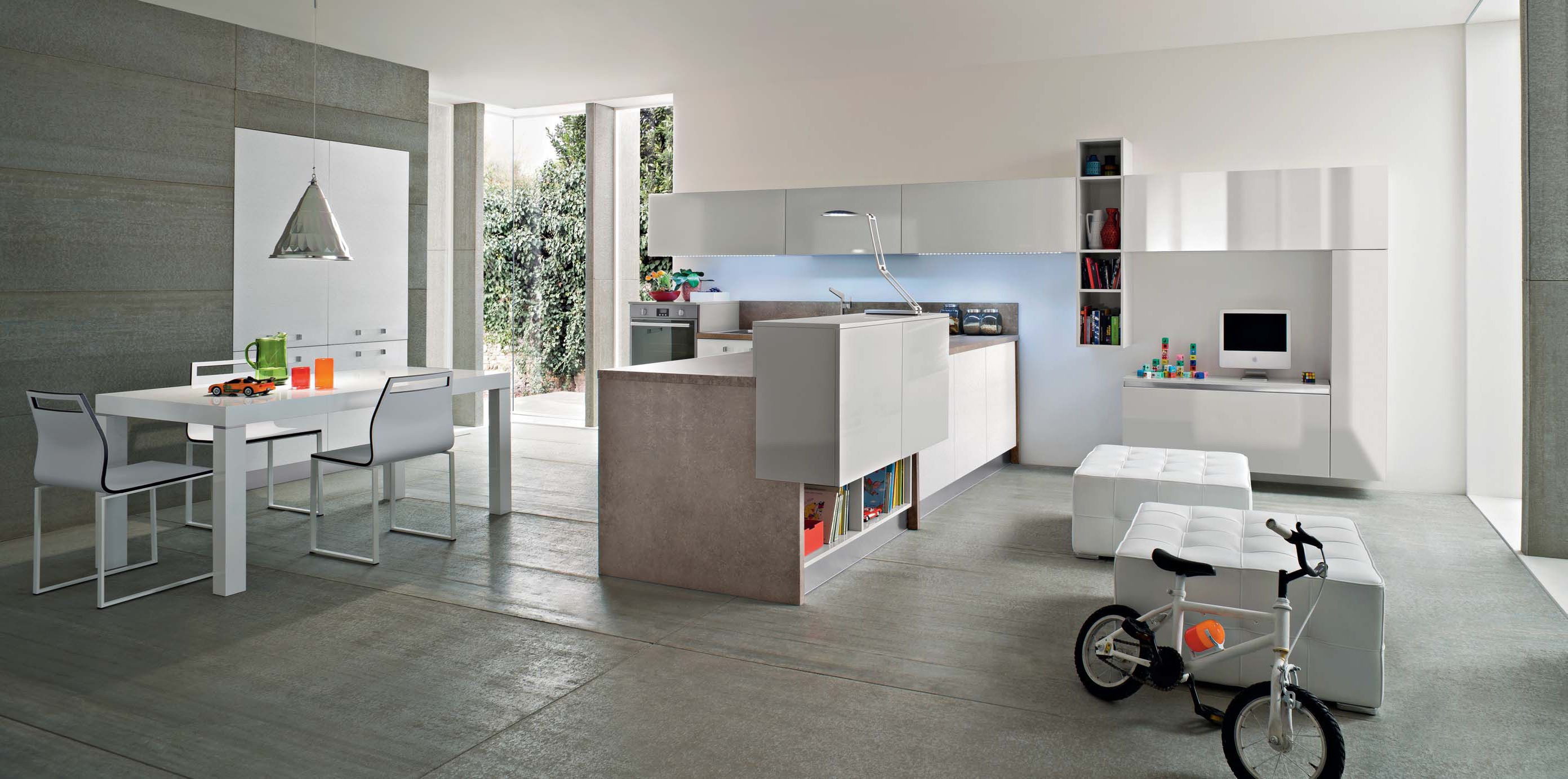 Kitchen Fly comp.2 from the Italian manufacturer Ar-Tre. The structure of the headset is made of water-repellent wood. Fronts made of MDF in high gloss lacquer finish and frosted in white with a horizontal stripe, metal accessories. The table top is made of quartzite. Built-in appliances. Colors to choose from manufacturer's catalogue. Kitchen equipped with innovative appliances, such as stove, glass sink and built-in extractor in the countertop. The kitchen space flows into the living area, thus creating the effect of continuity. Functional solution for your modern kitchen.