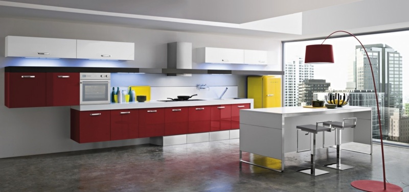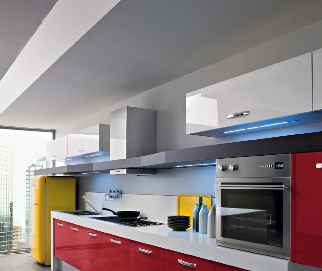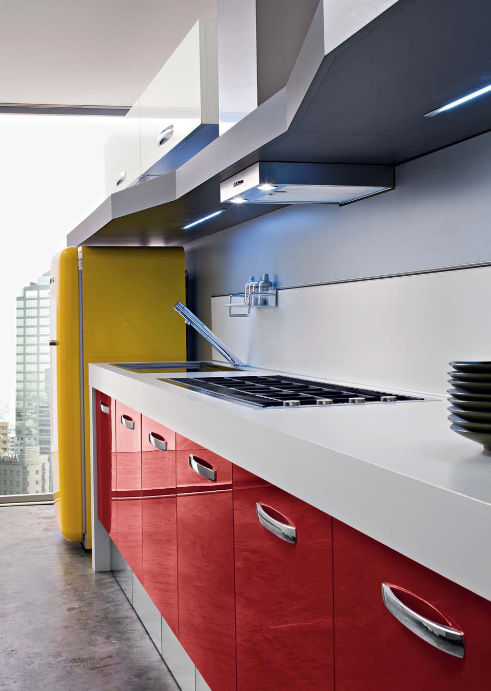 Kitchen Fly comp.6 from the Italian manufacturer Ar-Tre. The structure of the headset is made of water-repellent wood. Fronts made of MDF in high gloss lacquered finish, in combination of white and Burgundy colors, accessories made of chrome plated steel. Countertop made of artificial stone. Built-in appliances. Colors to choose from manufacturer's catalogue. Kitchen impresses with an unexpectedly bright combination of colors, its geometry, and unexpected combinations that violate all of the templates. The modern style of execution.