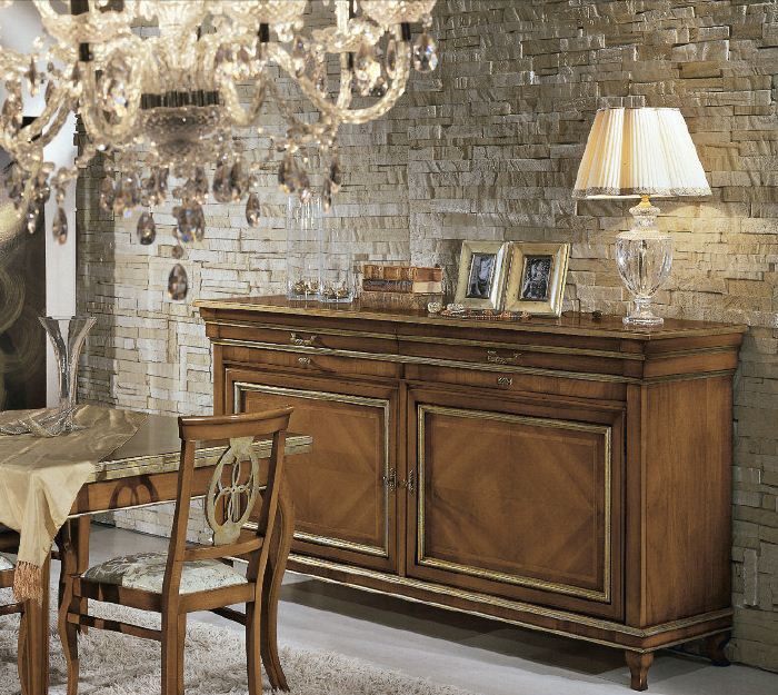 A snack bar Armonie from the Italian manufacturer Arve Style. The product on short curly legs, two hinged doors, drawers. Frame, the base is made of solid walnut. Exterior decoration can be carried out under the walnut, fir, or cherry. The layout of the fibers on the doors forms a diamond-shaped figure. Interior from Tanganyika. The surface is varnished. Decor are gold plated slats on the facade. Accessories metal, figure. The buffet will perfectly fit into the classic interior of living room, dining room.