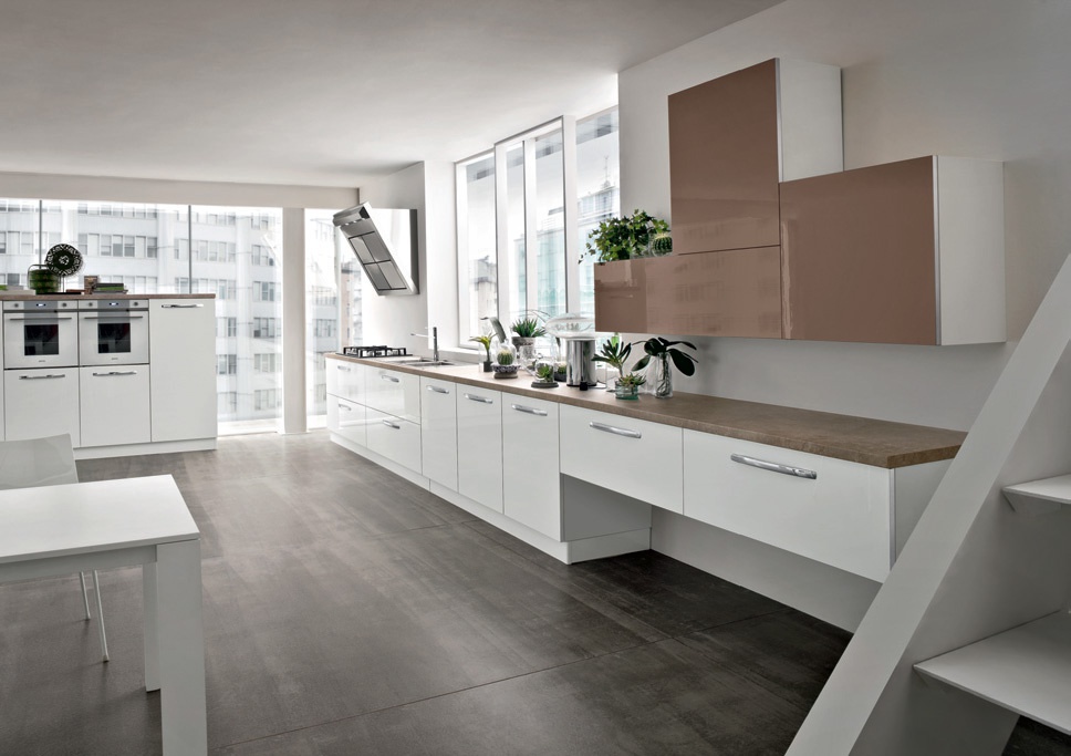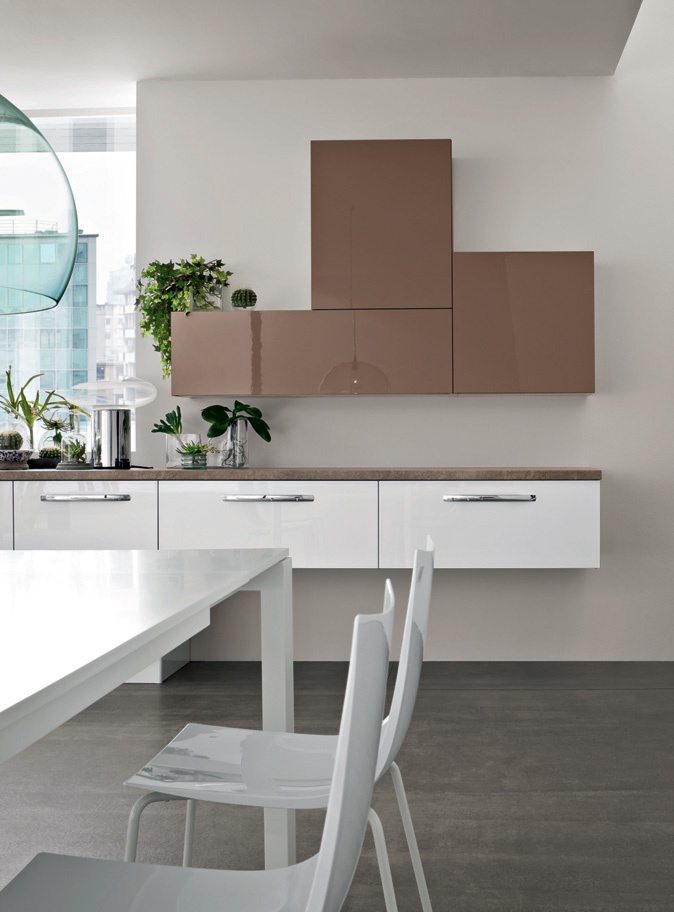Kitchen Onda comp.5 from the Italian manufacturer Ar-Tre. The structure of the headset is made of water-repellent wood. Fronts made of MDF in high gloss lacquered finish, mocha and white metal handles. The table top is made of quartzite. Built-in appliances. Colors to choose from manufacturer's catalogue. Aesthetic give geometrically composed of mounted elements and combination of colours. The kitchen is designed in modern style.