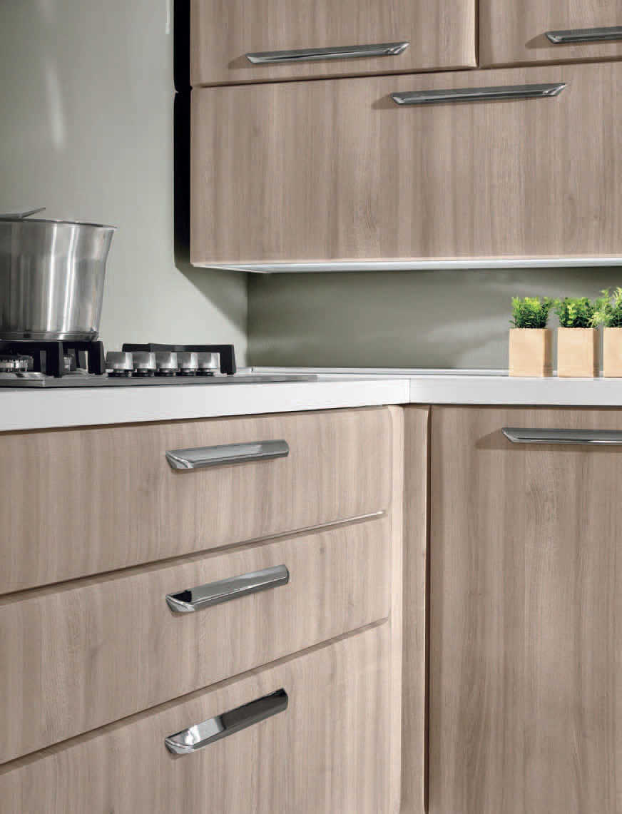 Kitchen (kitchen set) Tidra Evo from the Italian manufacturer Aran Cucine. The model is made of a polymeric material, glossy or Matt finish. Accessories chrome steel. The style is modern. Colours in stock.