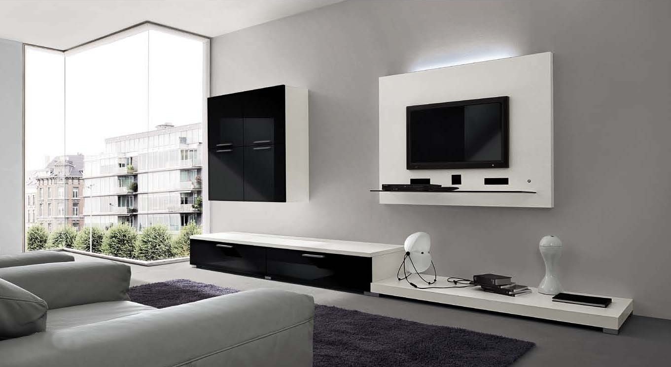 Forma modular system from Italian manufacturer Maronese. The model is made in modern style, made of wood. Colors white and black. The system consists of wall units, wall panel for TV with glass shelf and lights and cabinets with doors and panel. Door covered with black lacquer. The perfect modular system for modern living room.