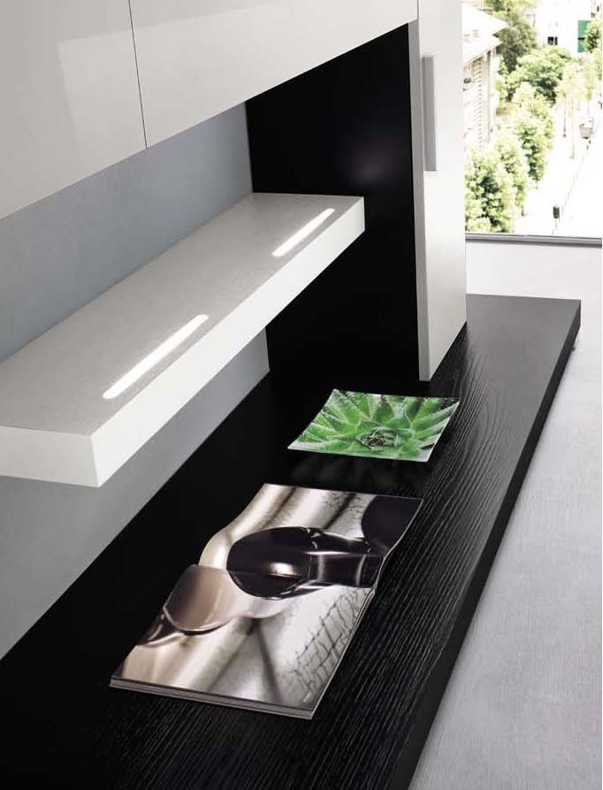 Forma modular system from Italian manufacturer Maronese. The model is made in modern style, made of wood. Colors white and black. The system consists of wall units, floor panels for TV and shelves for books with illumination. The doors are lacquered white. The modular system of the original form will attract attention to Your design and uniqueness.