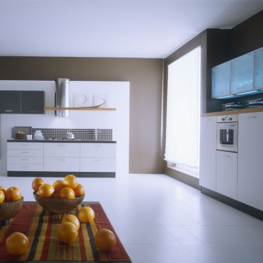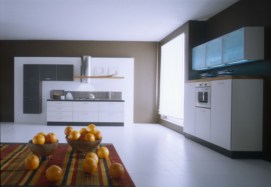 Kitchen (kitchen set) Aloe Italian manufacturer of Arrex le cucine. Dynamic design and contemporary style. Doors in aluminum frame. Available options for matte finish - orange, cream, mocha, walnut, red, natural oak, dark oak and grey oak.