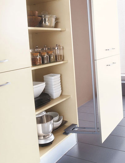 Versatility is achieved through a wide range of cabinets by size and content. Various colors available colors - orange, cream, mocha, walnut, red, natural oak, dark oak and grey oak. The facade in aluminum frame.