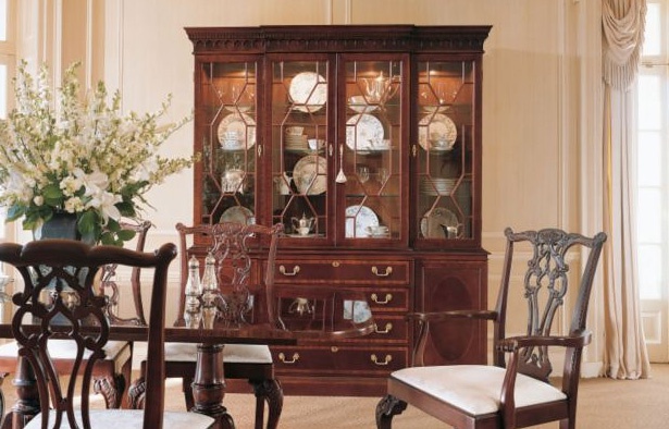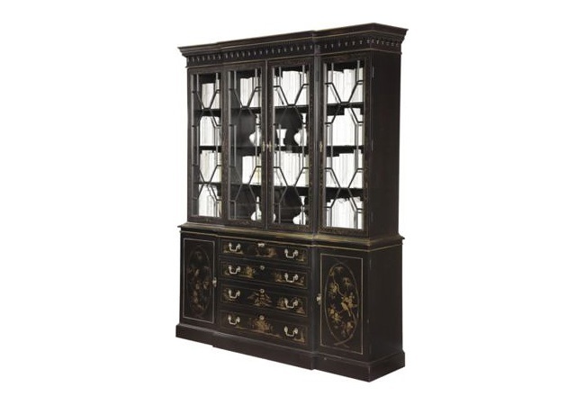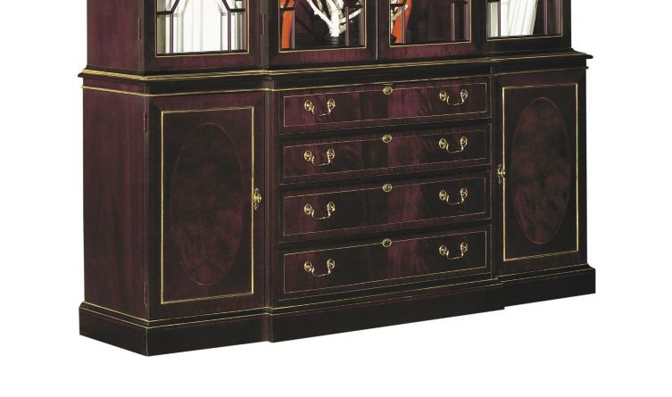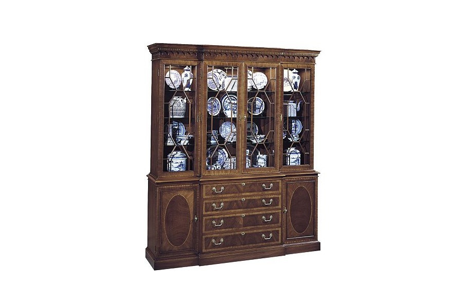 Sideboard Breakfront from the American manufacturer Hickory Chair. Made of mahogany, satin wood and carved moldings. The model has 4 doors with 9 adjustable plate grooved glass shelves. Base has 4 drawers, one with locking mechanism and lining fabric. Two doors feature oval inlays.