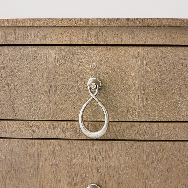 Dresser from Adelaide American manufacturer of Studio A. Made of figured eucalyptus with a soft gray finish, specially designed on antique equipment. The inset in the top with leather trim. Legs with tips of Nickel.