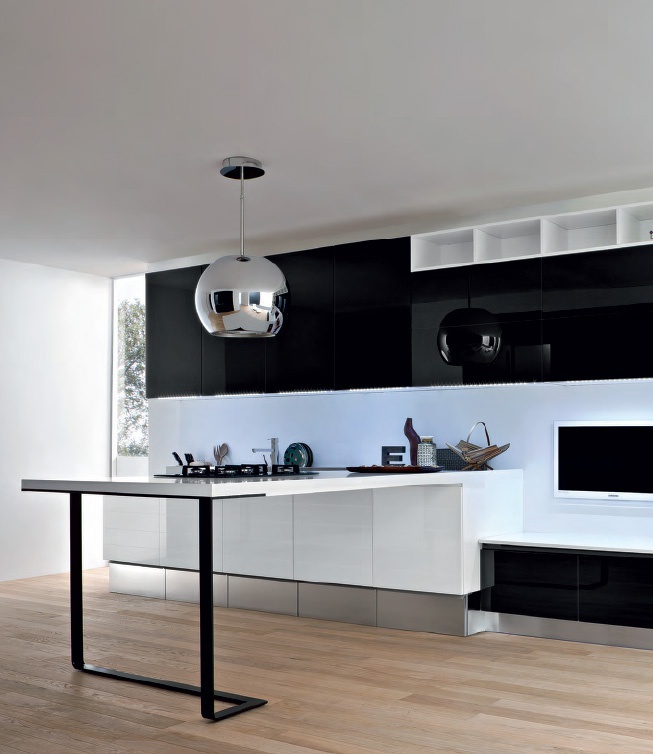 Kitchen Mirror comp.3 from the Italian manufacturer Ar-Tre. The structure of the headset is made of water-repellent wood. Facades in white and glossy black glass with horizontal stripes, metal accessories. Countertop made of artificial stone. Built-in appliances. Colors to choose from manufacturer's catalogue. Kitchen full of sliding elements and internal content, provided bar, led backlight. The perfect solution for your kitchen in a modern style.
