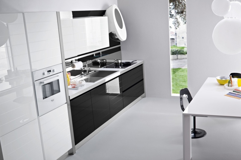 Kitchen Mirror comp.4 from the Italian manufacturer Ar-Tre. The structure of the headset is made of water-repellent wood. Facades in white and glossy black glass, fittings metal. Countertop made of artificial stone. Built-in appliances. Colors to choose from manufacturer's catalogue. Kitchen full of sliding elements and internal content. The combination of functionality and clear shapes and contrasting colors. The perfect solution for your kitchen in a modern style.