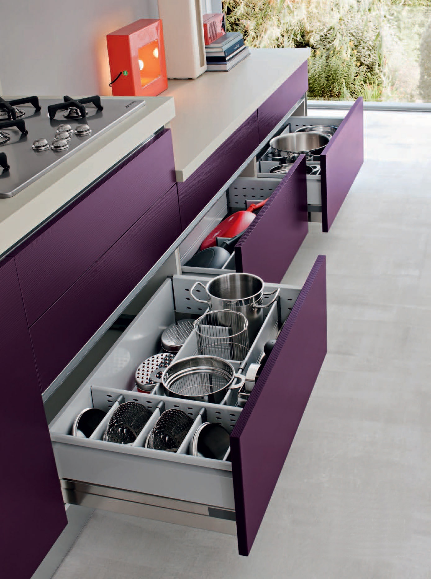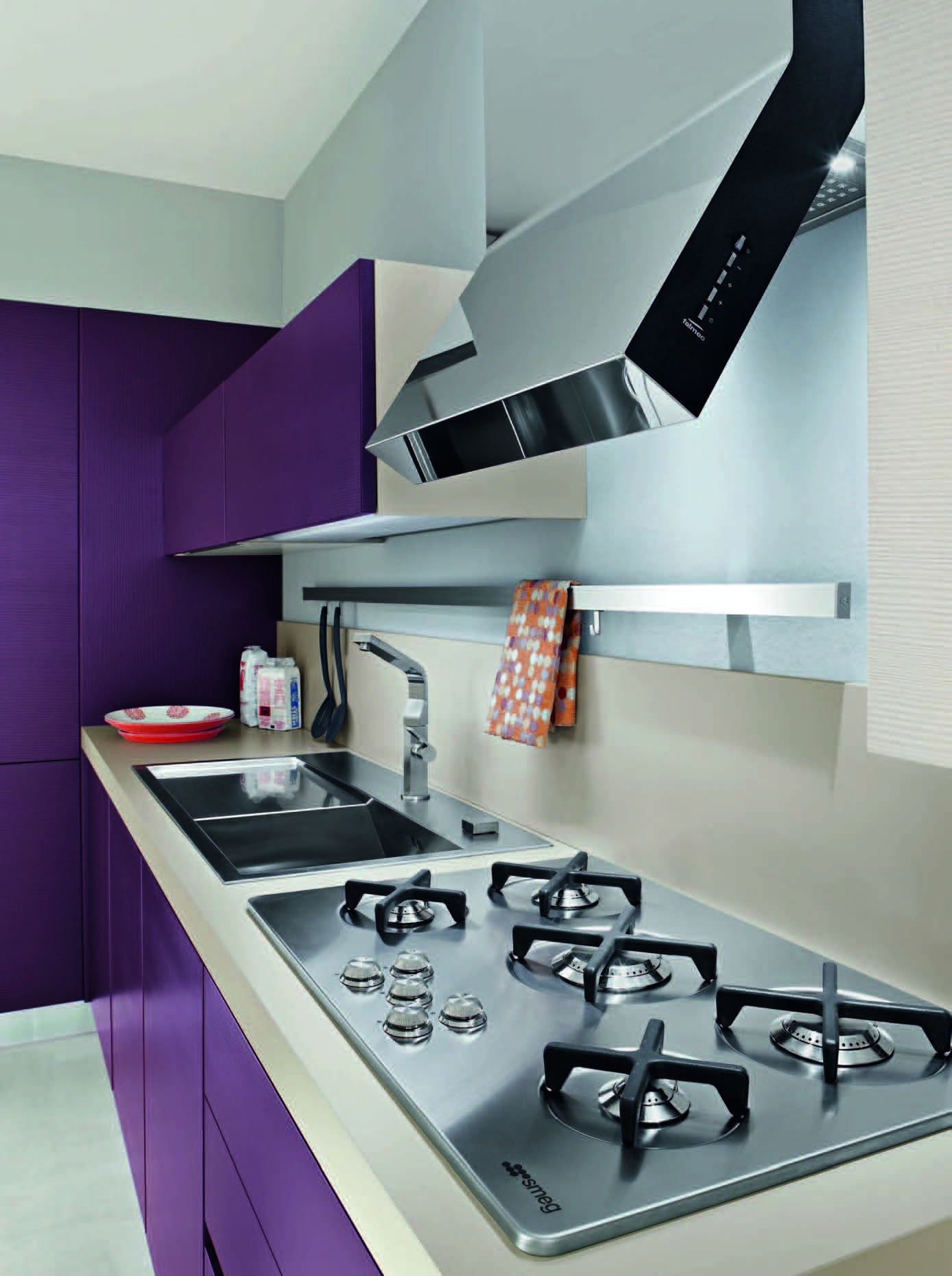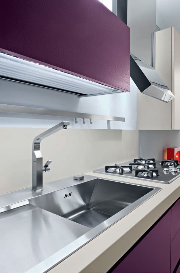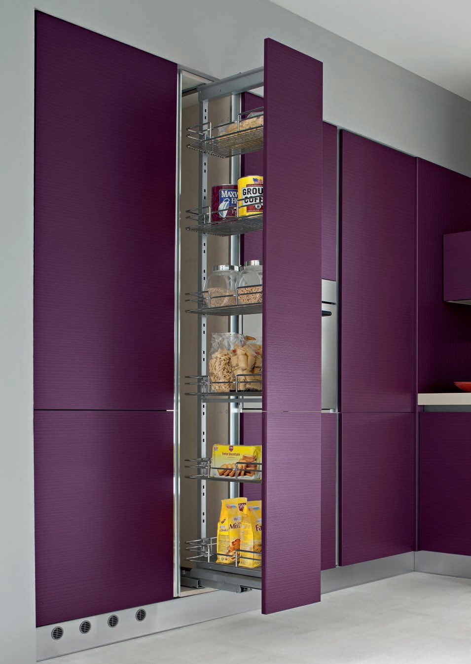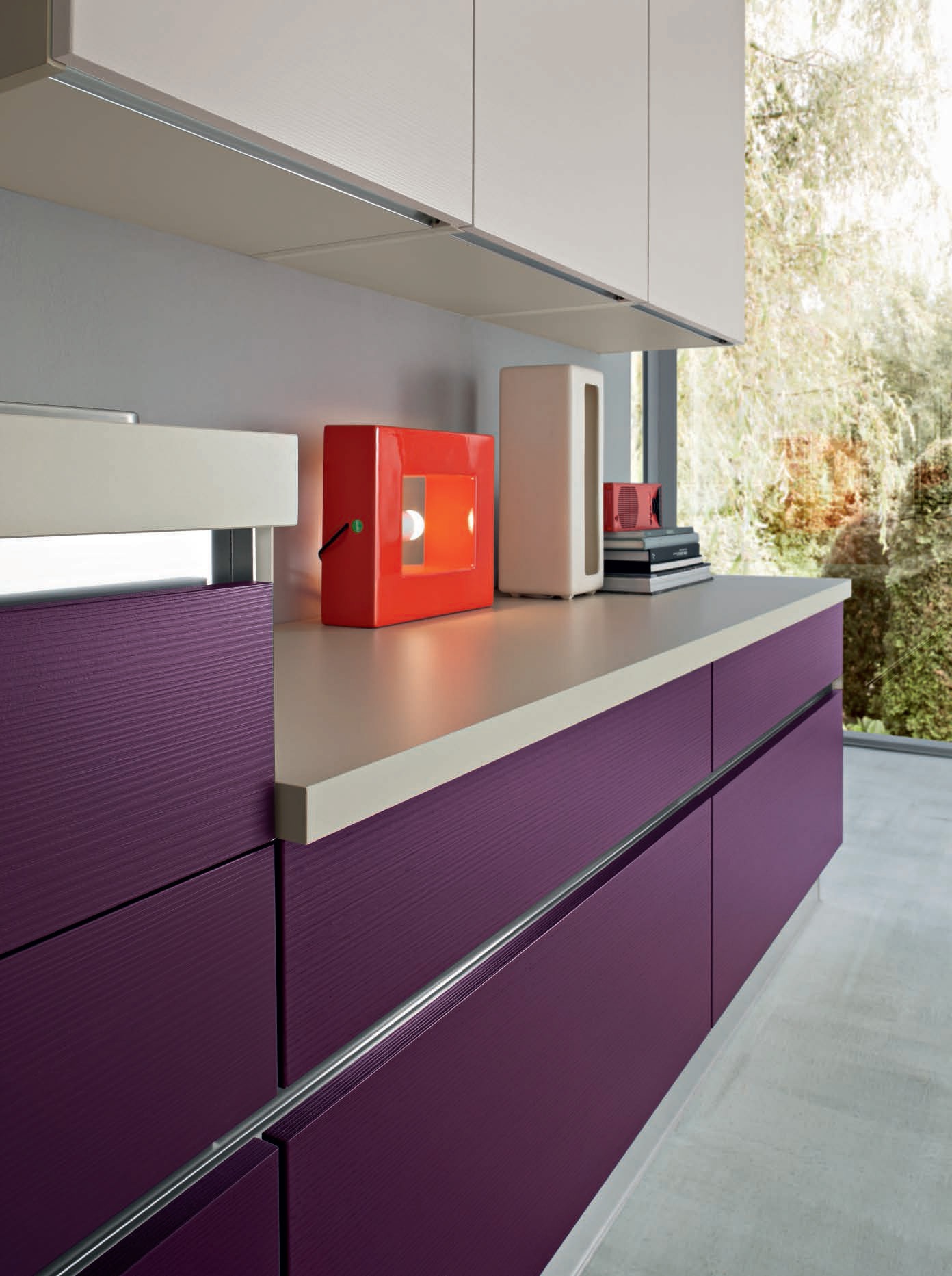 Kitchen Riga comp.4 from the Italian manufacturer Ar-Tre. The headset frame is made of waterproof wood. The facades with visible structure of wood combined with ivory and plum, pens, goals and base metal. Countertop made of artificial stone. Built-in appliances. Colors to choose from manufacturer's catalogue. Soft and original lines are part of the concept of this model. Internal storage conceal technological features dishes that allow you to optimize space. Kitchen designed in modern style.