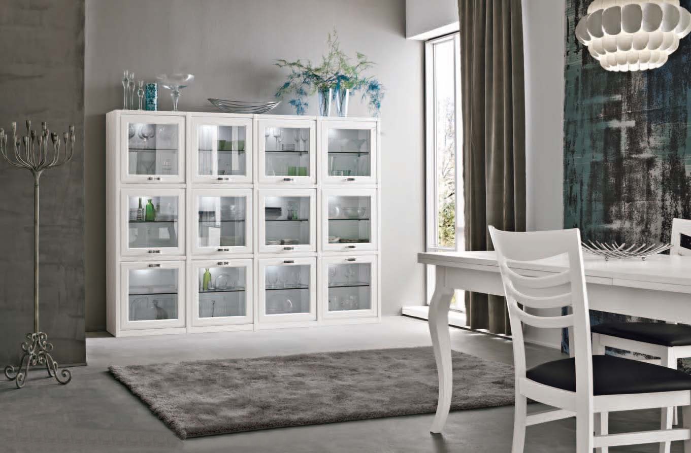 Gardenia modular system from Italian manufacturer Maronese. The model is made in modern style. Colours in stock. Frame - wood. Can be equipped with internal lighting. The system consists of small storefronts. Inside has glass shelves. The many glowing Windows create comfort, which is essential to any dining room or living room.