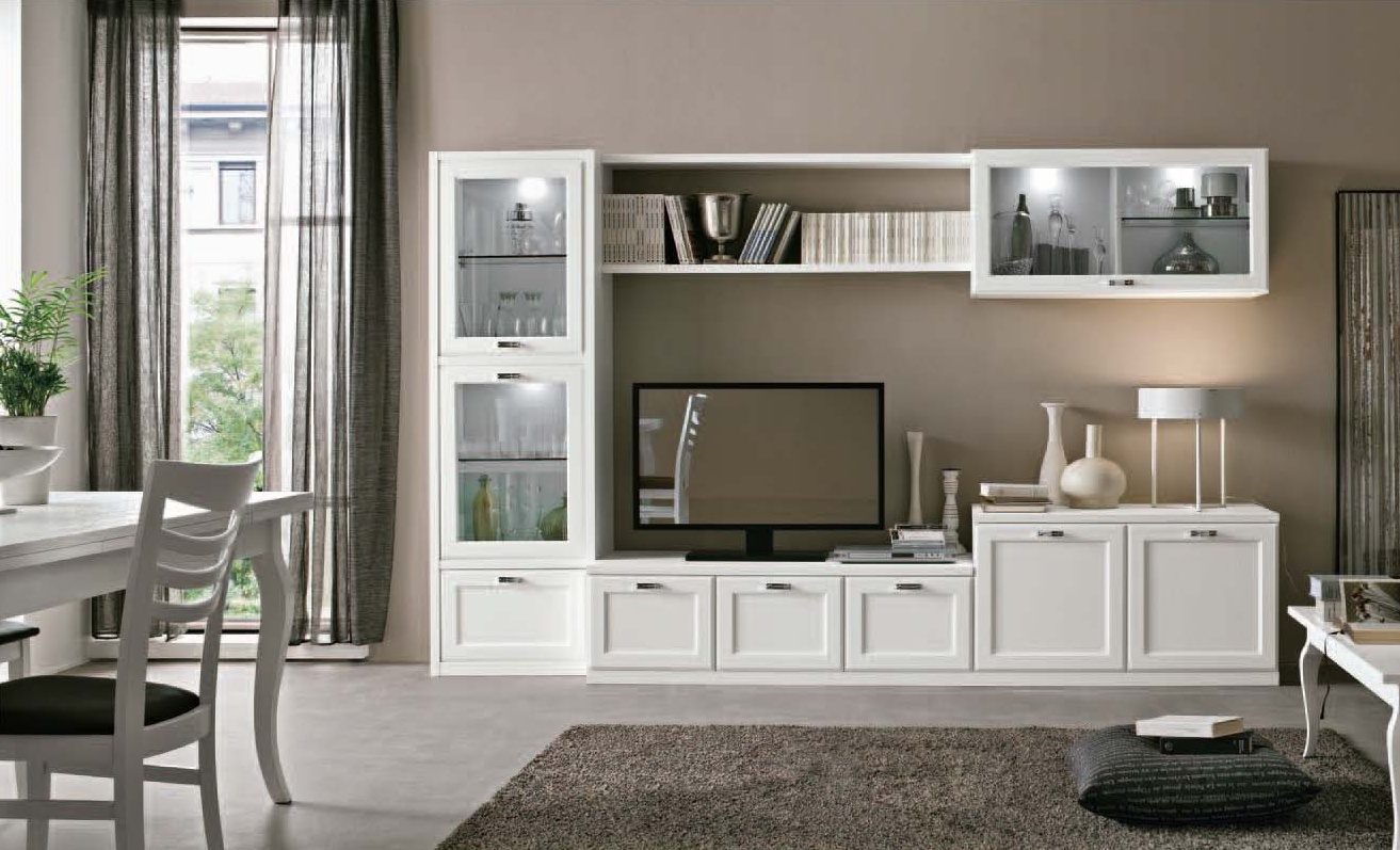 Gardenia modular system from Italian manufacturer Maronese. The model is made in modern style. Colours in stock. Frame - wood. Can be equipped with internal lighting. The model has Windows, shelves, cabinets and Cabinet for TV. The modular system of Gardenia is a wonderful option for modern interiors.
