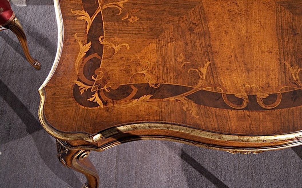 frame, table top: solid wood finish: veneer coating: lacquered decor: inlay decor: silver plated decor: patina |
