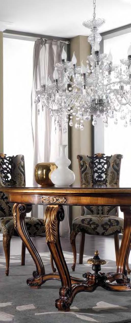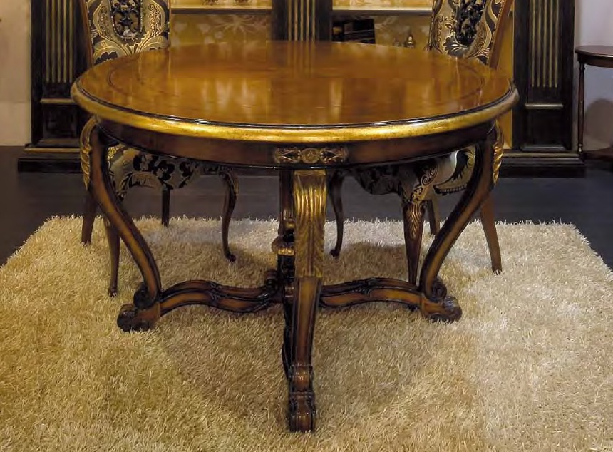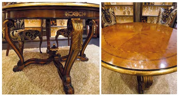 The Royal dining table from Italian manufacturer Arve Style. Table with round top in figured base. Frame, table top made of solid wood. Finish - wood veneer from valuable breeds of a tree. Decoration is elegant carvings in gold. Colors from the range. The table in the Baroque style, perfectly fit into living room, dining room in classic style.