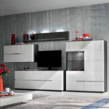 Living room (sofa set) Gemma from the Italian manufacturer Maronese. The composition is made in a modern style. Colours in stock. Frame - wood. Can be equipped with internal lighting. Set has window, shelf, wall Cabinet and floor Cabinet. Doors are opening system PUSH-PULL. Convenient and multifunctional composition perfectly complement and decorate Your interior.