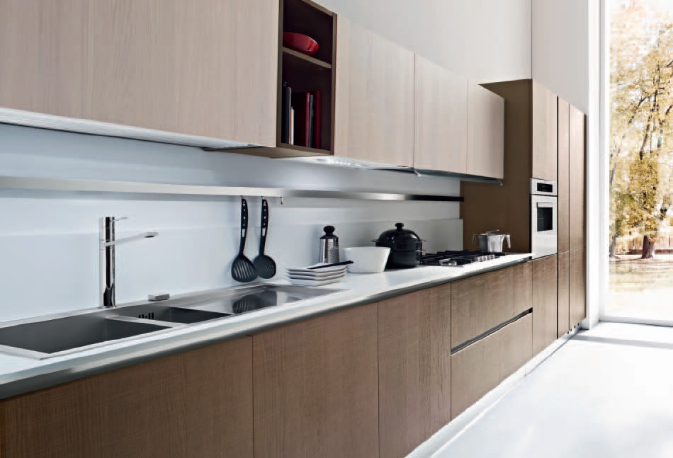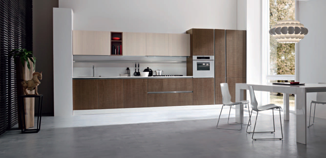 Kitchen Trama comp.4 from the Italian manufacturer Ar-Tre. The model is made of waterproof wood. The facades with visible structure of wood, pen, goal, accessories made of chrome plated steel. Countertop made of artificial stone. Built-in appliances. Colors to choose from manufacturer's catalogue. This kitchen has a necessary set of furniture elements, expresses a new concept in modern style thanks to the beauty of the facades with minimalist design and elegance. The modern style of execution.