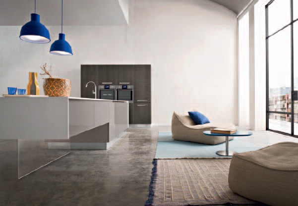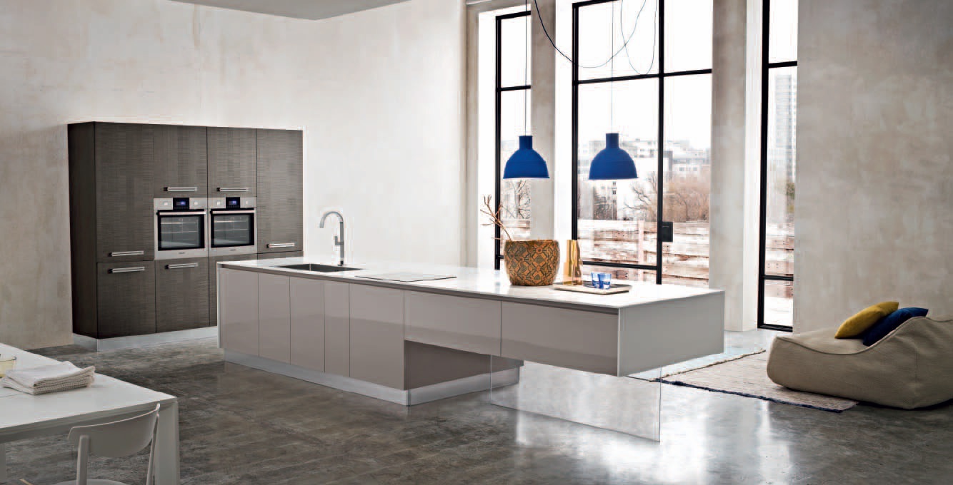 Kitchen Trama comp.5 from the Italian manufacturer Ar-Tre. The model is made of waterproof wood. Fronts made of solid oak in a gray tone with visible wood structure and MDF in a glossy lacquer finish, handle-goals, hardware metal. Countertop made of artificial stone. Built-in appliances. Colors to choose from manufacturer's catalogue. This kitchen expresses more than just a place for cooking, it combines living and dining areas, expresses a new concept in modern style thanks to the beauty of the facades with minimalist design and elegance. The modern style of execution.
