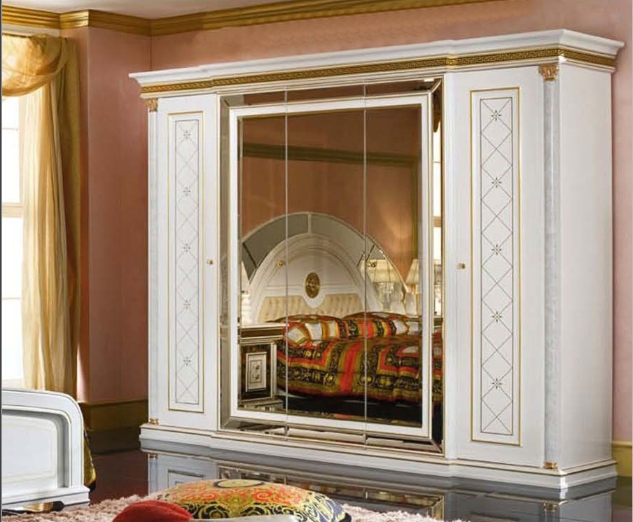 Wardrobe Zeus from the Italian manufacturer Maronese. The model is executed in classical Greek style. Frame - wood. The model has two wooden doors and three mirror. The facade is decorated with gold leaf and decorative pattern. Zeus wardrobe the perfect choice for a chic bedroom.
