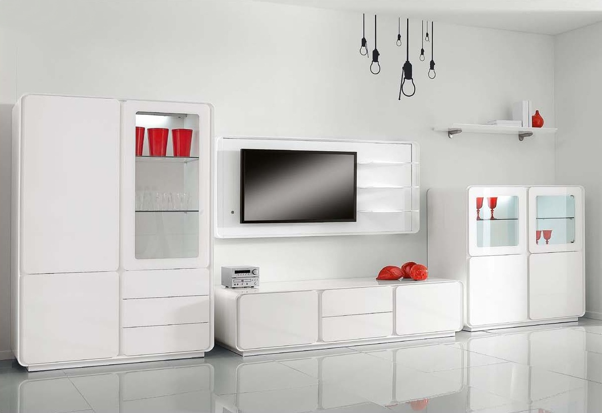 Living room (sofa set) from the Italian Settanta Maronese manufacturer. The composition is made in a modern style. Colours in stock. Frame - wood. Can be equipped with internal lighting. Set consists of two showcases, cabinets and panels for TV with shelves. An excellent option for modern living.
