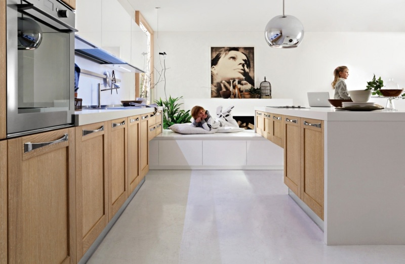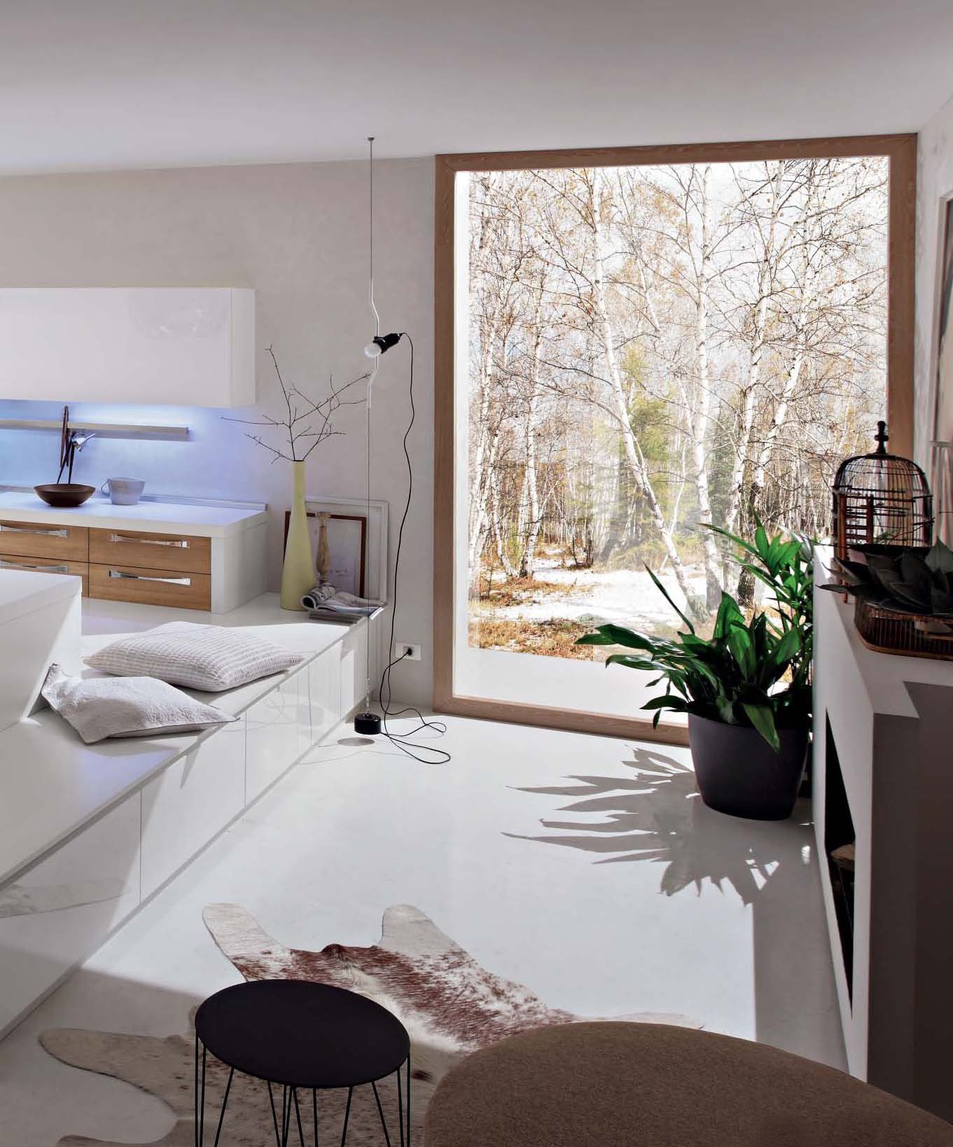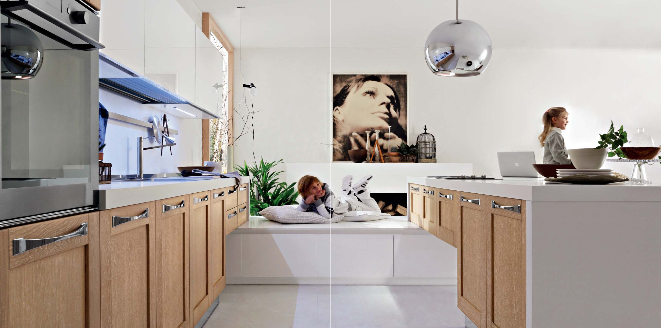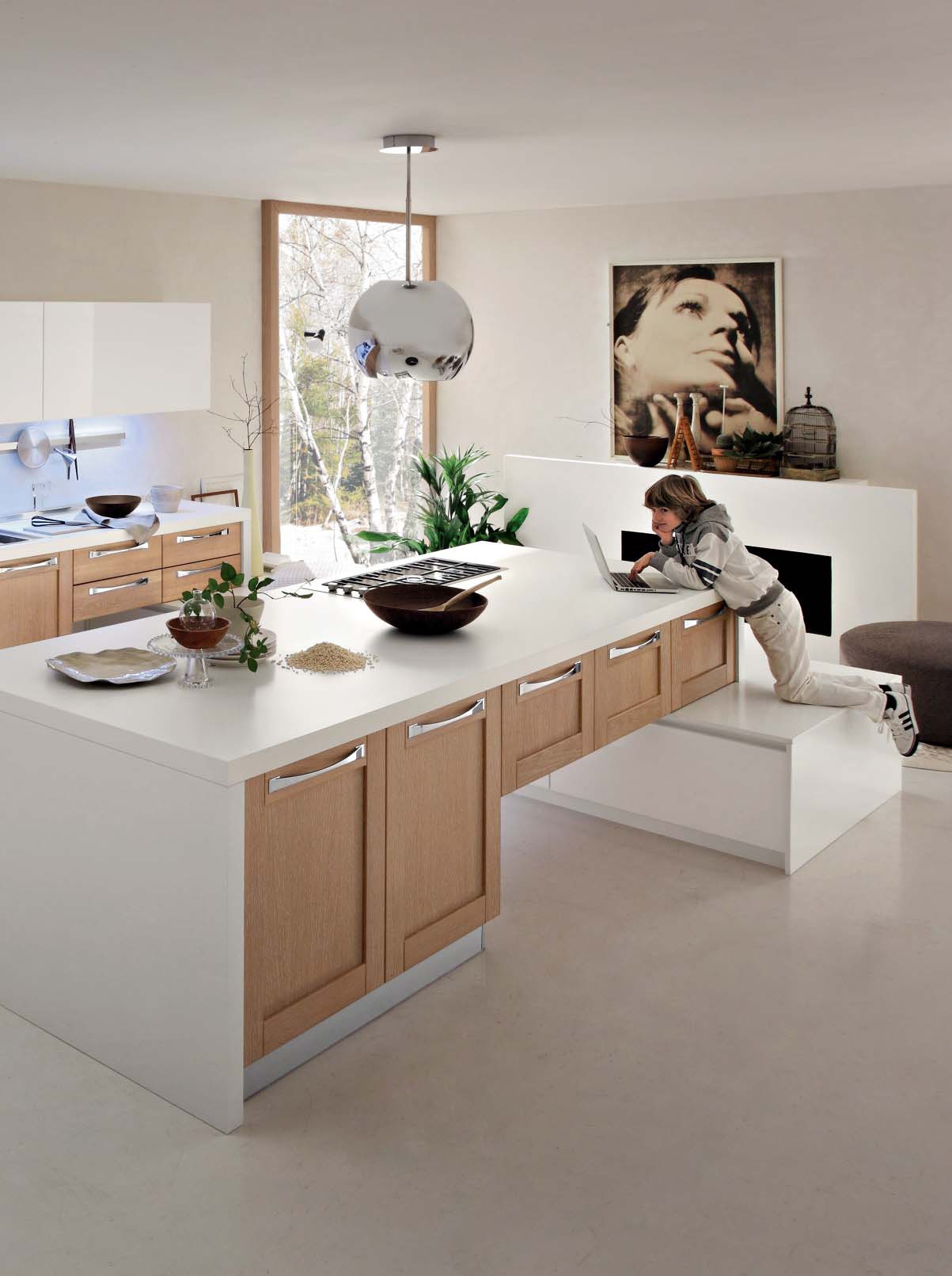 Kitchen Vanessa comp.1 from the Italian manufacturer Ar-Tre. The structure of the headset is made of water-repellent wood. The facades bleached oak and MDF in a high gloss white lacquer finish, handles, mountings and base of chromed steel. Countertop made of artificial stone. Built-in appliances. Colors to choose from manufacturer's catalogue. Innovative design solution demonstrated in this model, living and kitchen space together. Kitchen designed in modern style. Versatile solution for your kitchen.