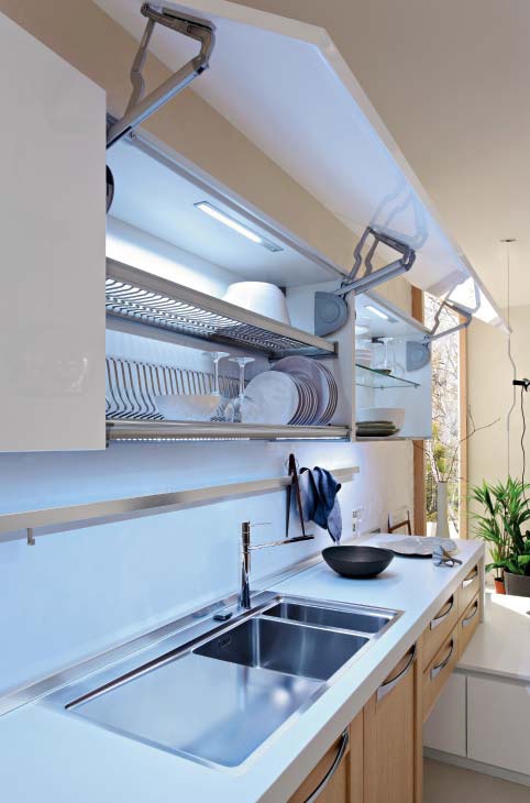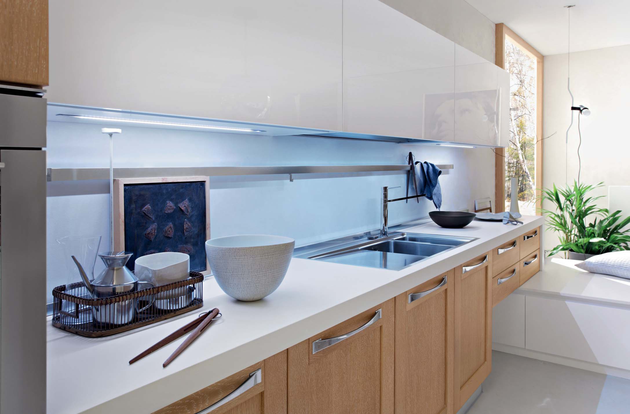 structure: wood facades: wood facades: MDF accessories: chrome-plated steel countertop: artificial stone facades: lacquered facades: bleached |