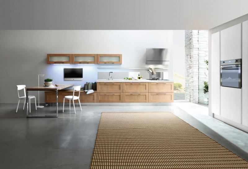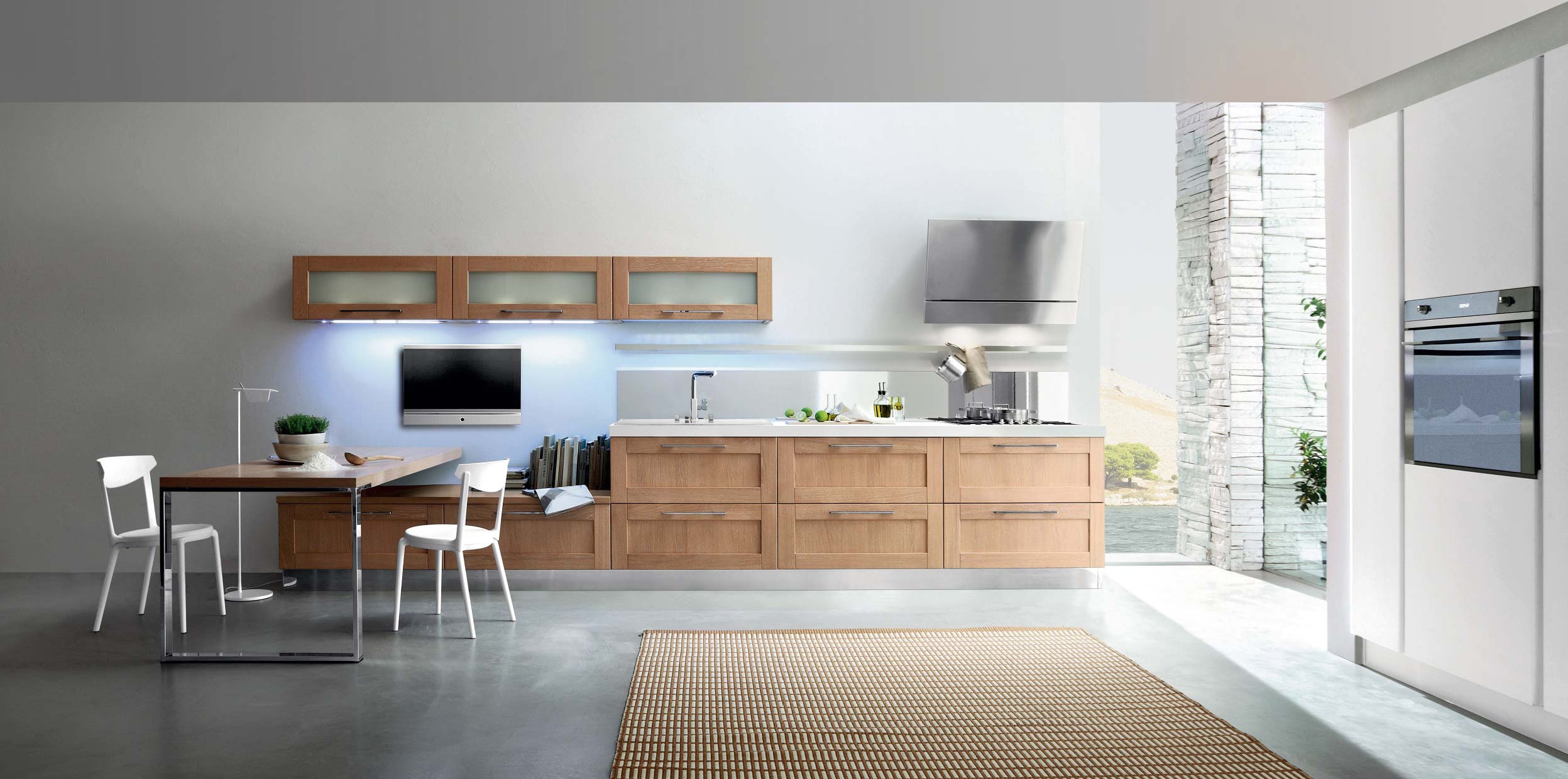 Kitchen Vanessa comp.3 from the Italian manufacturer Ar-Tre. The structure of the headset is made of water-repellent wood. The facades bleached oak and MDF in glossy white lacquer finish with embossed, chrome-plated steel fittings. Countertop made of artificial stone. Built-in appliances. Colors to choose from manufacturer's catalogue. Large storage space, practicality, emphasis on aesthetic appeal is concentrated in this model. Universal design solution in the organization of space was sent to make the kitchen a place where you can eat, cook and watch TV. Kitchen designed in modern style.