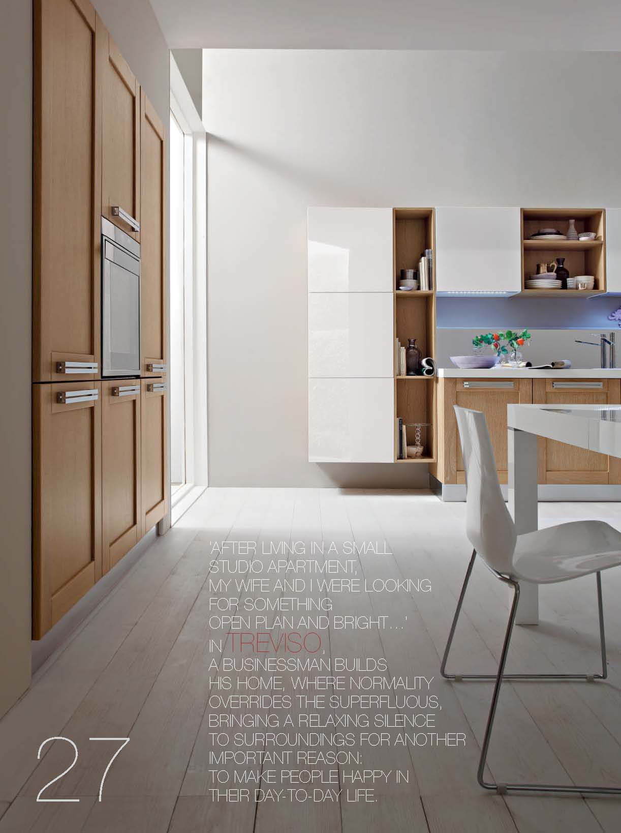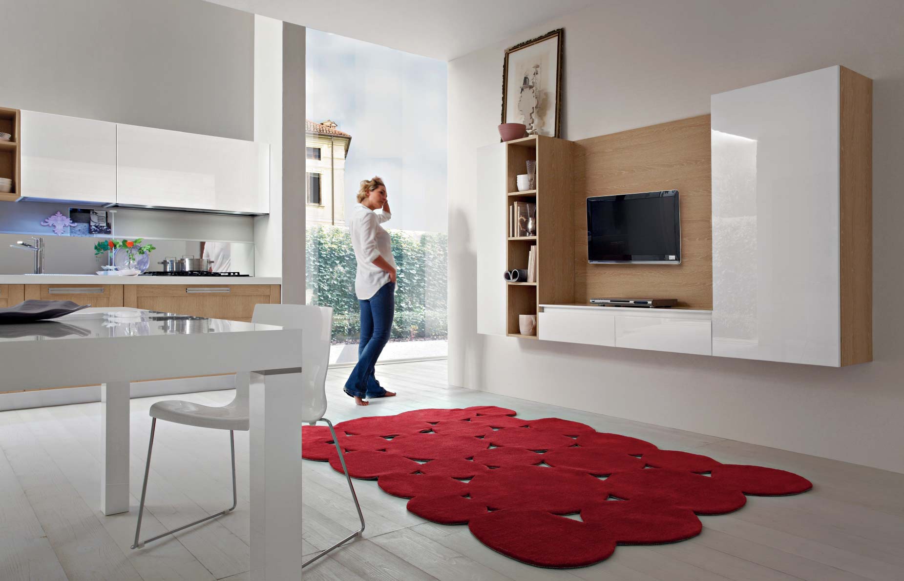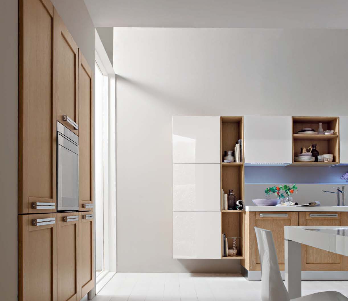 Kitchen Vanessa comp.4 from the Italian manufacturer Ar-Tre. The structure of the headset is made of water-repellent wood. The facades bleached oak and MDF in a high gloss white lacquer finish, accessories made of chrome plated steel. Countertop made of artificial stone. Built-in appliances. Colors to choose from manufacturer's catalogue. Kitchen space divided into zones, living and kitchen space together. Kitchen designed in modern style. Versatile solution for your kitchen.