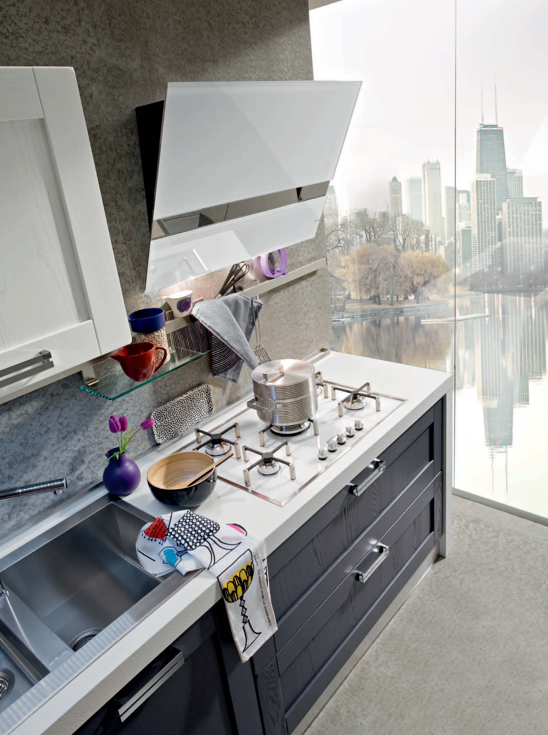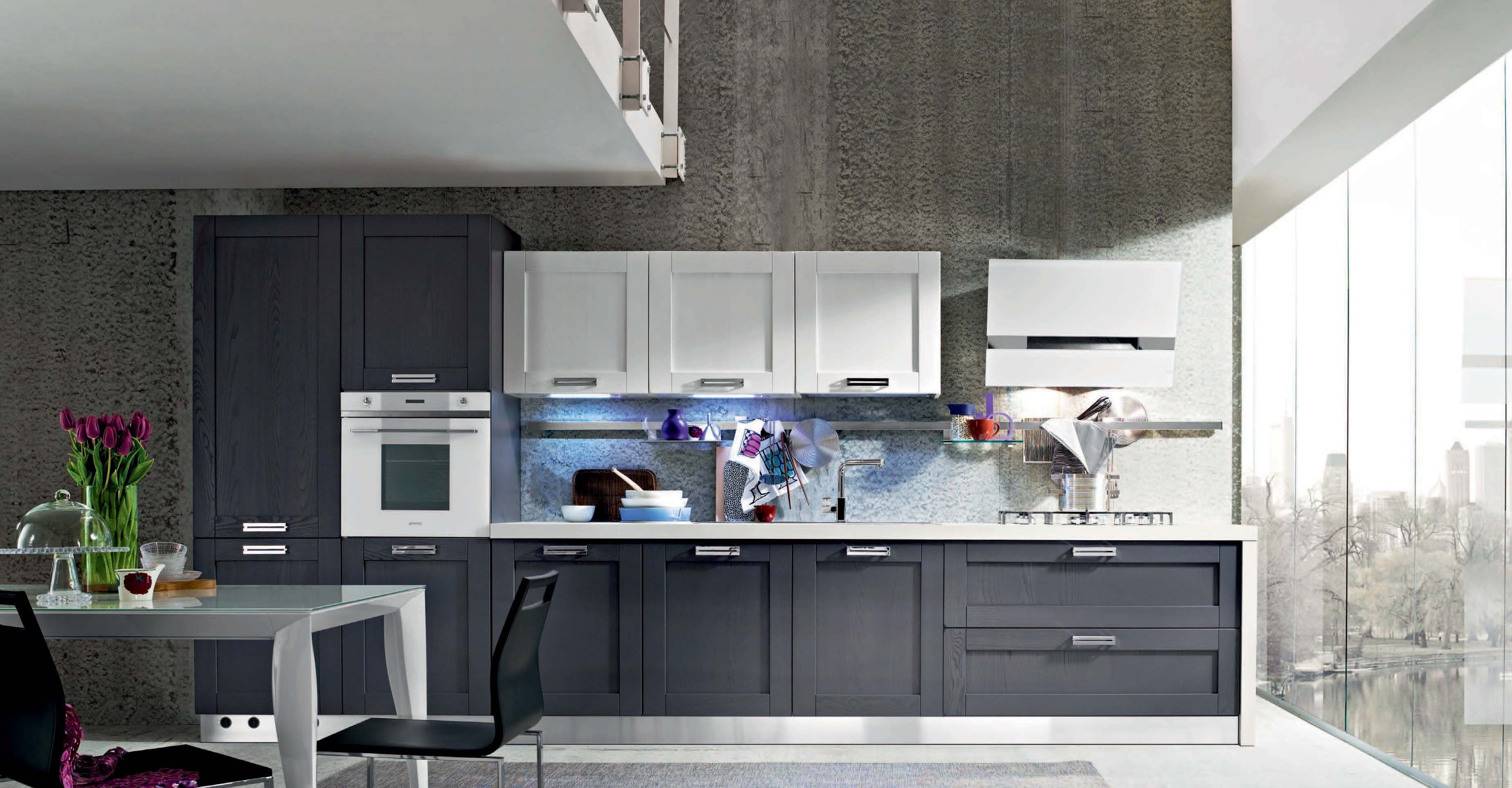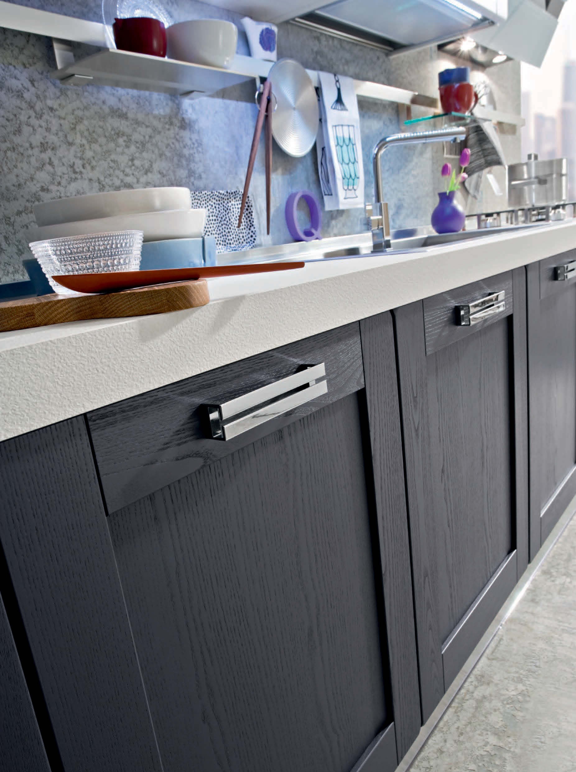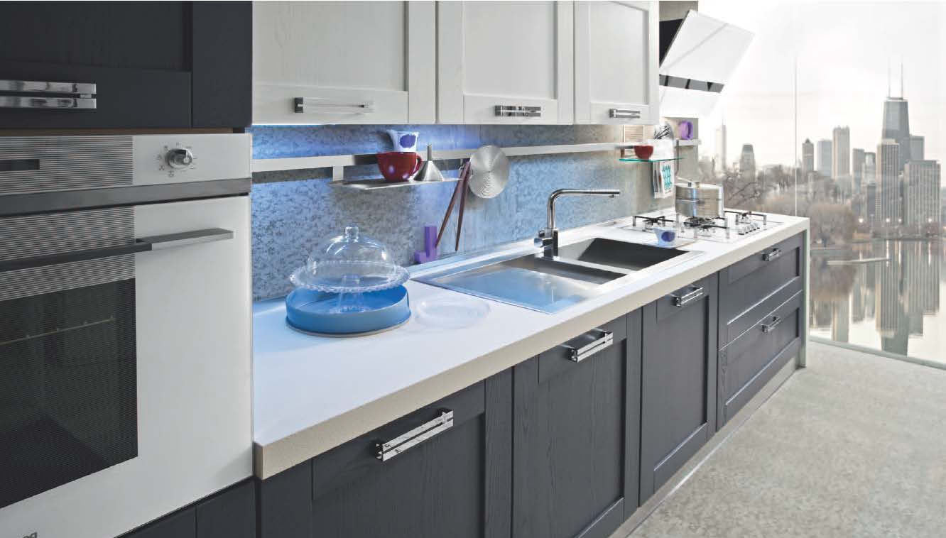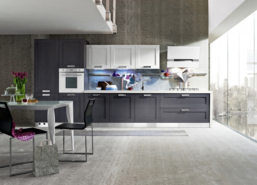 Kitchen Signoressa comp.2 from the Italian manufacturer Ar-Tre. The structure of the headset is made of water-repellent wood. The facades, in the decoration of the white lacquer and anthracite color with visible wood structure, furniture made of chrome plated steel. Countertop made of artificial stone. Built-in appliances. Colors to choose from manufacturer's catalogue. Simple lines, innovative technical equipment and the necessary set of elements are concentrated on the kitchen. Functional and ergonomic solution for kitchen in the modern style.