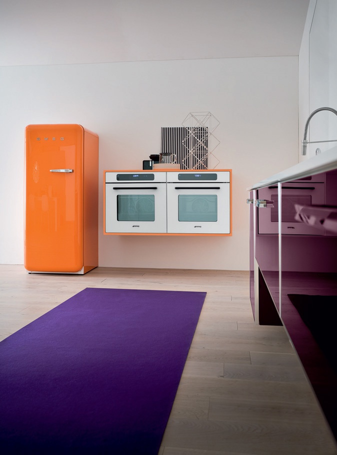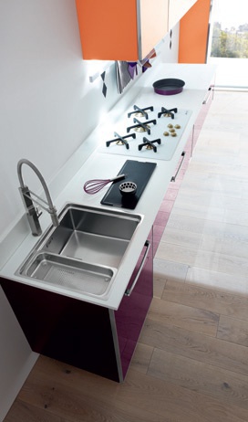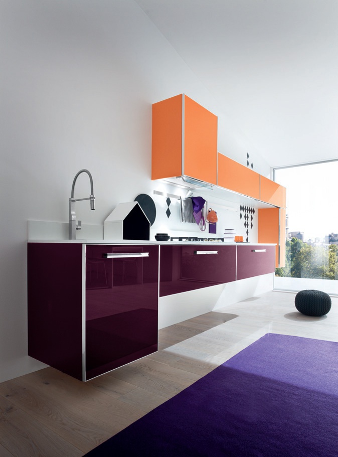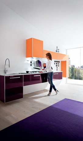 Kitchen Sistema Aluminum comp.2 from the Italian manufacturer Ar-Tre. The structure of the headset is made of water-repellent wood. Facades made of tempered glass, the combination of plum and orange colors, accessories made of chrome plated steel. Countertop made of artificial stone. Built-in appliances. Colors to choose from manufacturer's catalogue. Aesthetic appearance and functionality give geometrically composed of furniture elements and combination of colors. The kitchen is designed in modern style