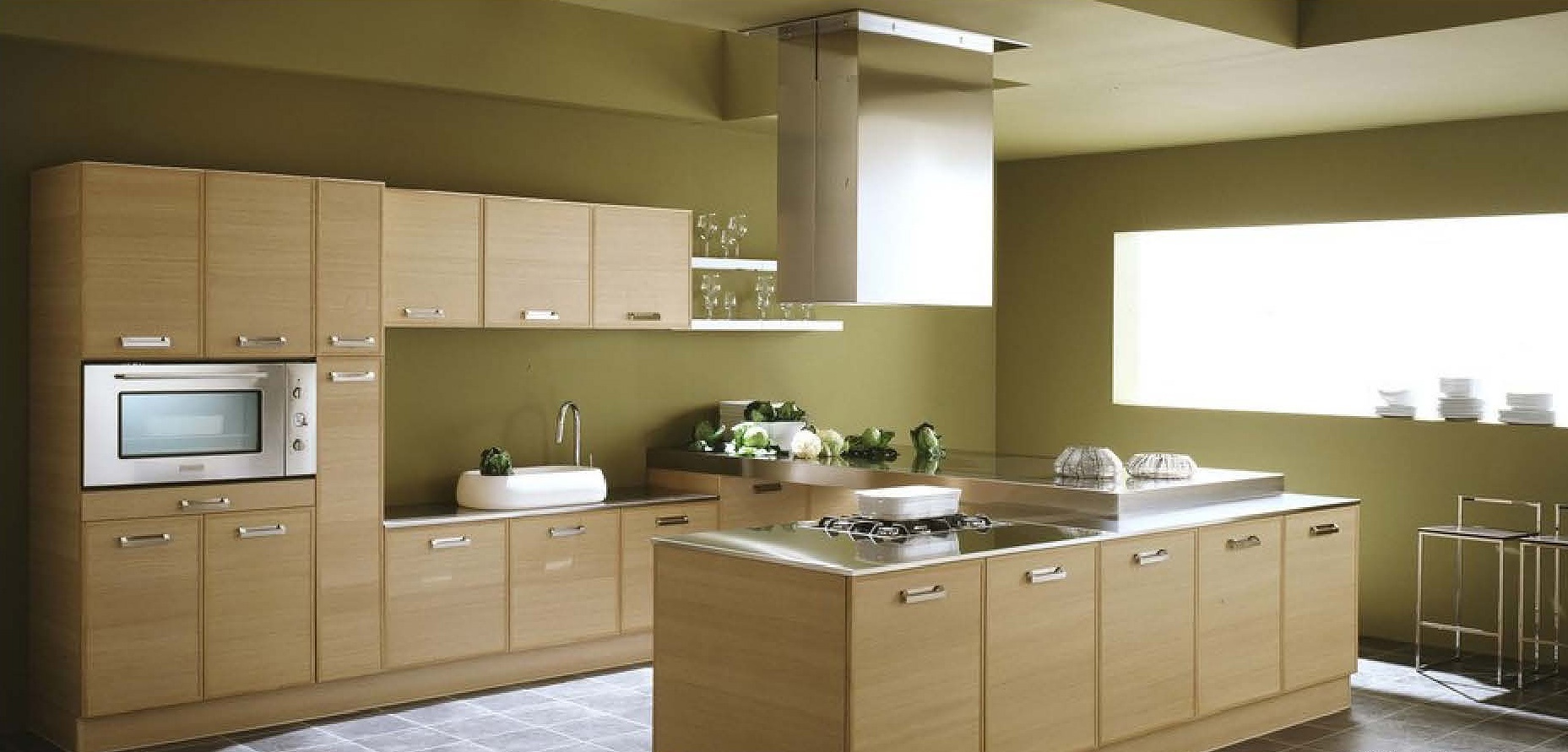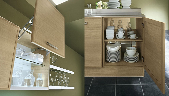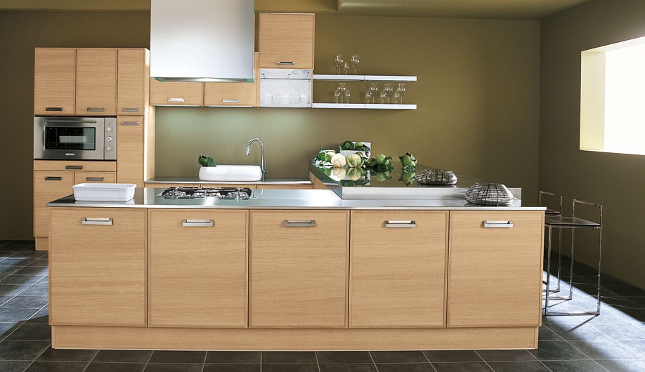Kitchen (kitchen set) Zaffiro Italian manufacturer of Arrex le cucine. The modern kitchen model is made in natural oak. Possible finishes in grey oak and cherry. Use fittings made of chrome steel.