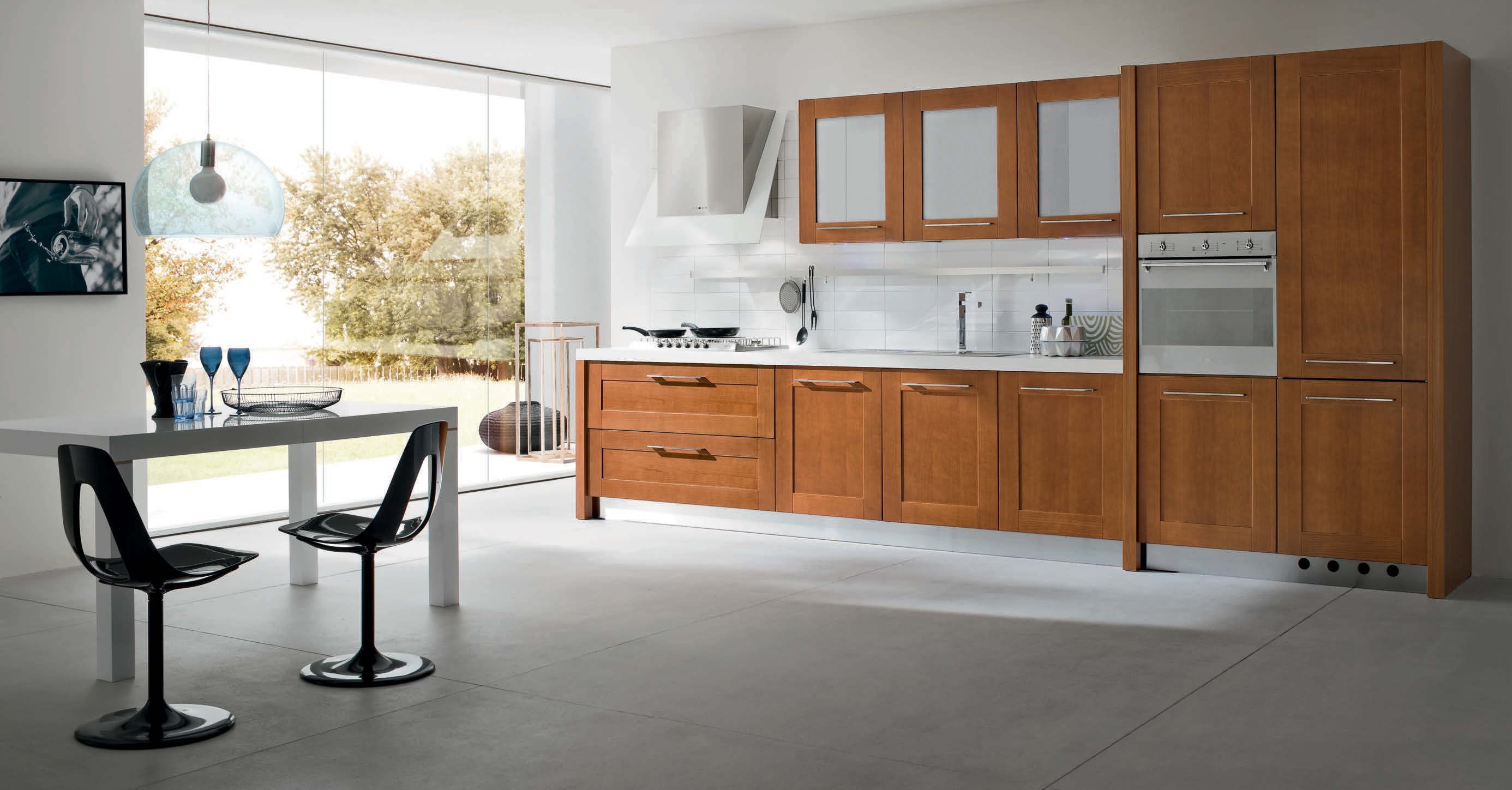 Kitchen Sistema legno comp.4 from the Italian manufacturer Ar-Tre. The structure of the headset is made of water-repellent wood. Fronts framework made from solid cherry, stainless steel fittings. Countertop made of artificial stone. Built-in appliances. Colors to choose from manufacturer's catalogue. Simple lines, innovative technical equipment and the necessary set of elements are concentrated in this model. Functional and ergonomic solution for kitchen in the modern style.
