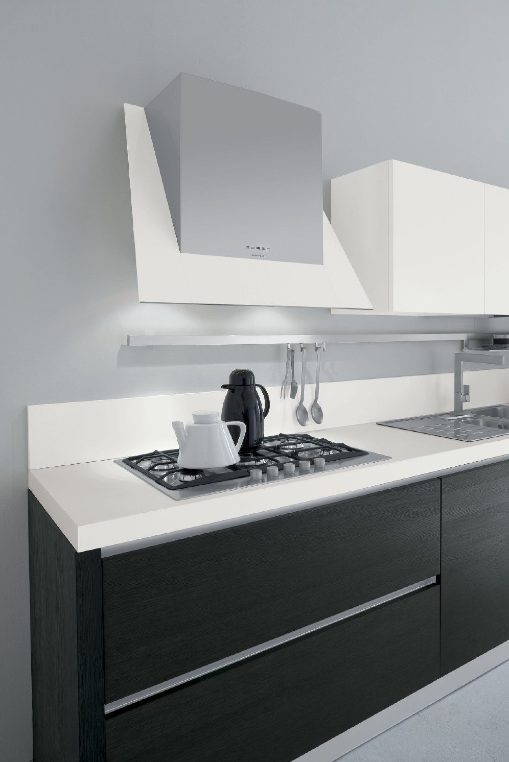 Kitchen Iride comp.5 from the Italian manufacturer Ar-Tre. The structure of the headset is made of water-repellent wood. The facades in black tone with open pores and made of MDF in white glossy lacquer, chrome-plated steel fittings. Countertop made of artificial stone. Built-in appliances. Colors to choose from manufacturer's catalogue. The lack of handles graphically enhances this composition, in this case, the linear design expresses simplicity and versatility. The contrast of the two colors provide high dynamics and overall effect. A stunning option for kitchen in modern style.