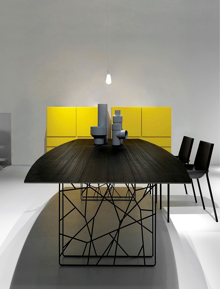 The Synapsis table by Italian manufacturer Porro. Model on a frame of twisted steel rods, forming a web. Offers a large selection of countertops. The modern design. Colours in stock.