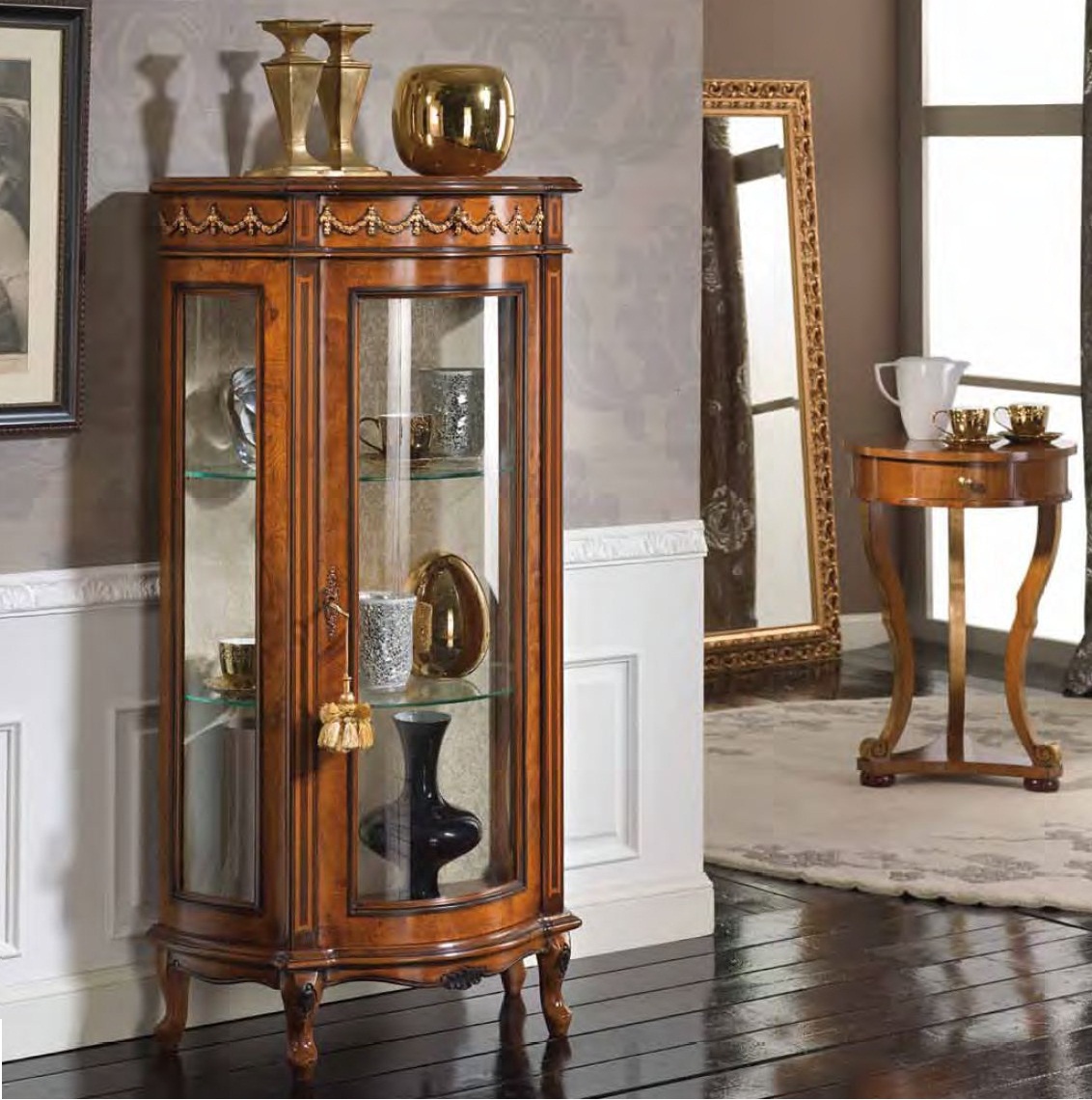 Showcase Ilaria from the Italian manufacturer Arve Style. The housing base is made of solid wood, varnish finish from the range. The flap, sides and shelves are made of glass. The rear surface of the wall - decoration in damask brocade. The decor is gilded, carved. The product is semi-circular on figured legs. Perfect for classic interiors and for modern.