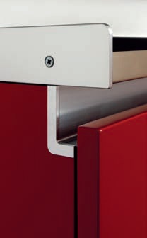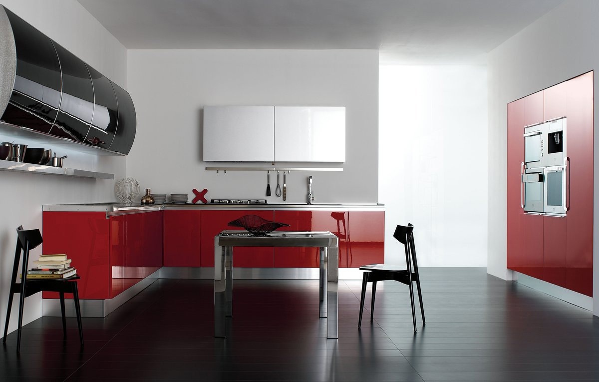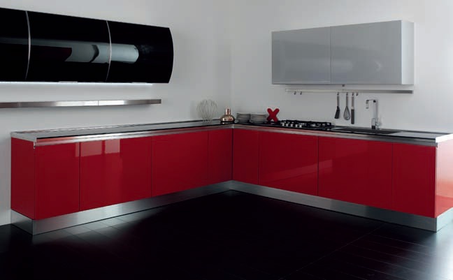 Kitchen (kitchen set) from Volare Italian manufacturer Aran Cucine. Composition models a glossy, lacquered by brush painting, fiery red and metallic silver. The case is MDF wood. Fittings - chrome-plated steel. The model is made in modern style.