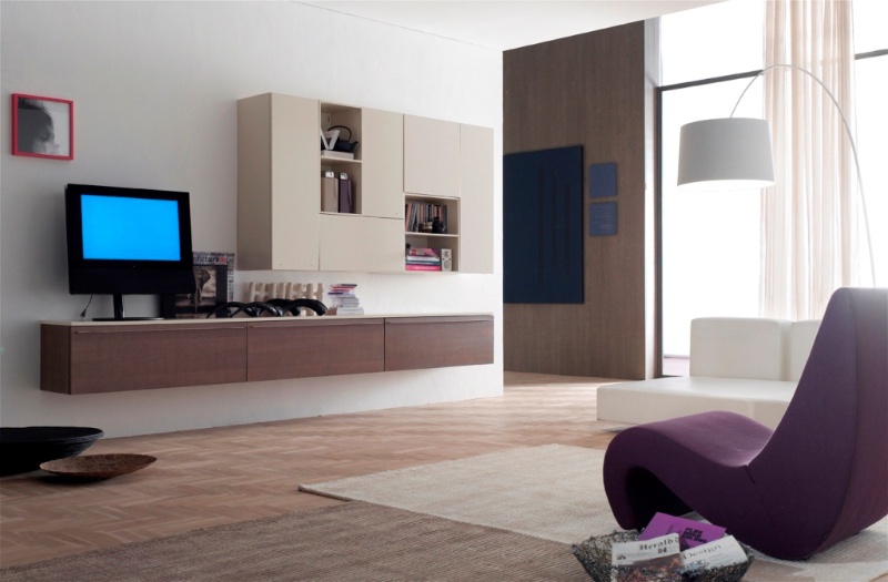 Modular system Seta from the Italian manufacturer Maronese. The model is made of wood. The system is designed in a contemporary style. Colours in stock. The composition consists of wall units, open compartments, shelves and long tables. Ideal for Your interior.