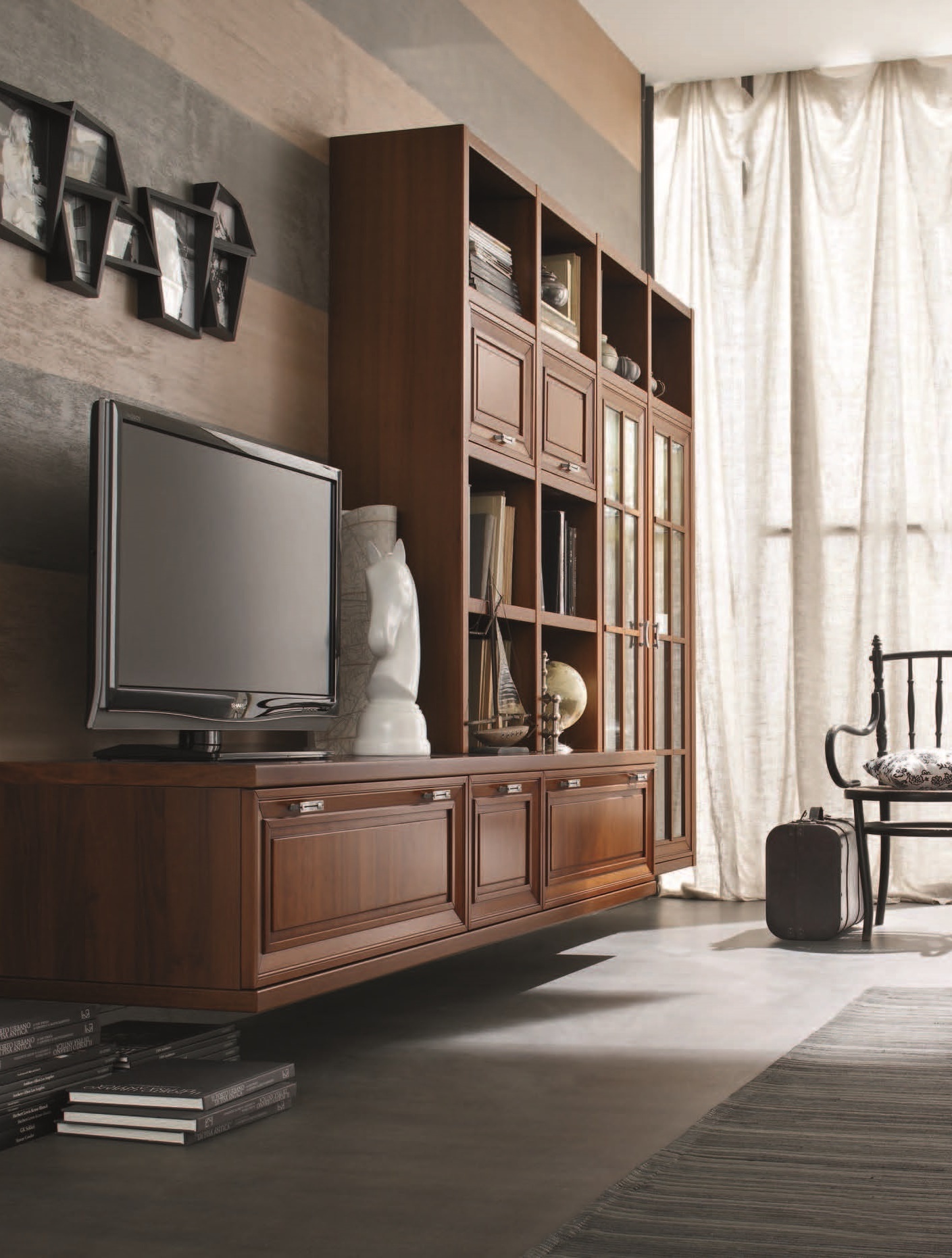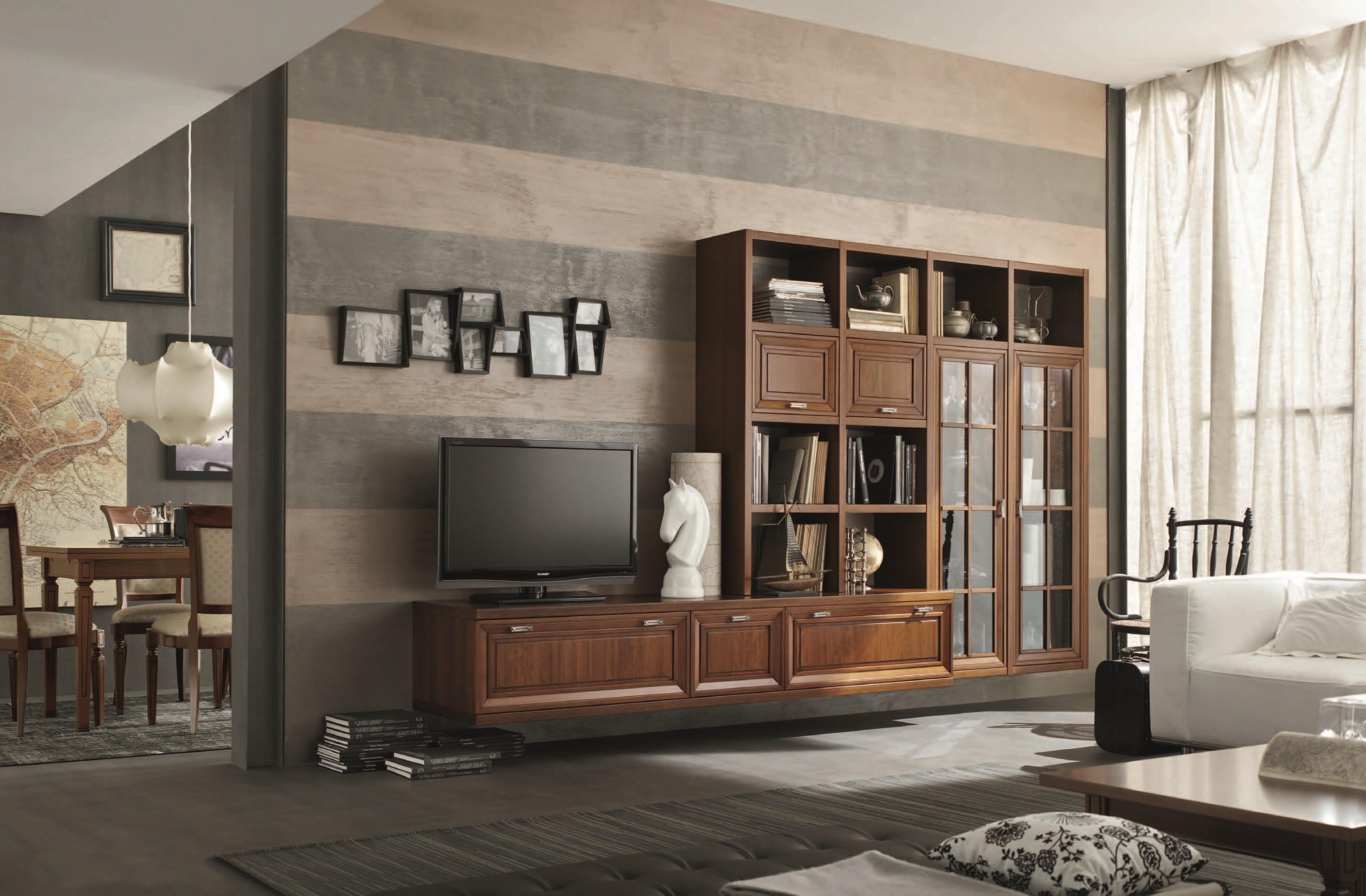 Murano modular system from Italian manufacturer Maronese. The model is made of wood. The system is designed in a classic style. Colours in stock. The sculpture consists of two door Windows, open and closed shelves, lockers and cabinets for TV. Murano modular system is perfect for Your living room.