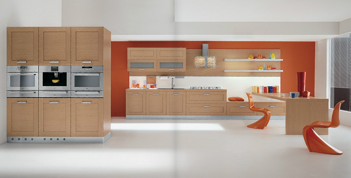 Kitchen Lyra comp.6 from the Italian manufacturer Ar-Tre. The structure of the headset is made of water-repellent wood. The facades are of solid light oak with a strong wood structure, stainless steel fittings. The table-top working area is made of artificial stone, table of wood. Built-in appliances. Colors to choose from manufacturer's catalogue. Kitchen space is well thought out and functional: area for cooking, table the rectangular form and harmonious open elements light. Kitchen designed in modern style.