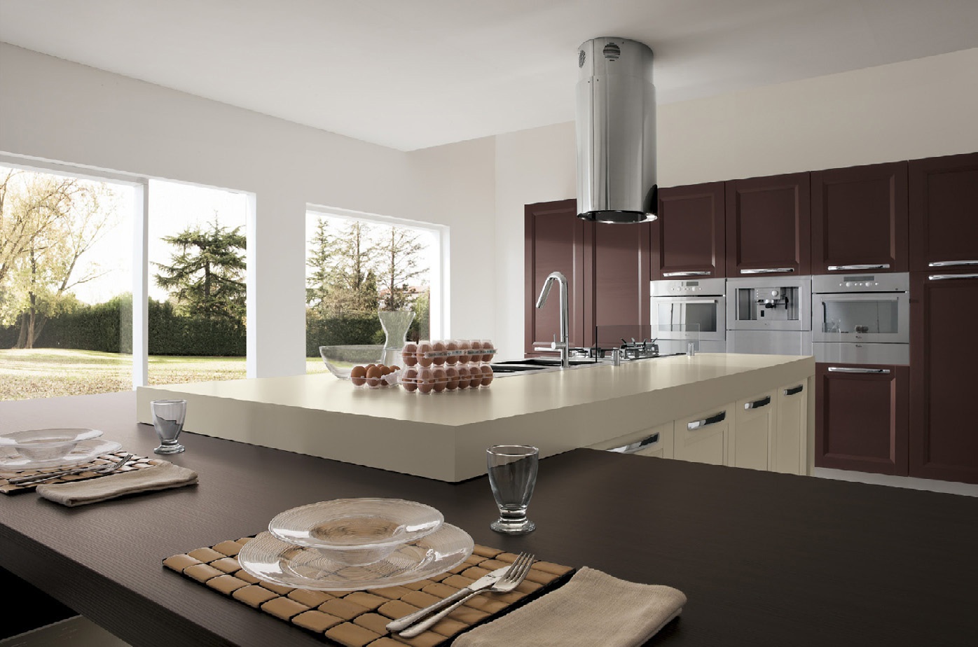Kitchen Playa comp.2 from the Italian manufacturer Ar-Tre. The structure of the headset is made of water-repellent wood. The facades in the decoration of beige and brown lacquer with visible structure. The table-top working area is made of artificial stone, bar tops made of wood. Built-in appliances. Colors to choose from manufacturer's catalogue. Elegant and harmonious combination of colors is obtained by alternating brown and beige lacquer, emphasizing the dynamism and modernity. The location of the island and the bar break all the rules of the plan, connecting the kitchen and living area together. Functional and refined version of a modern kitchen.