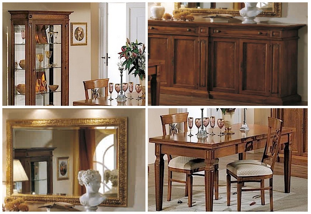 Set for the dining room Donatello from the Italian manufacturer Arve Style. Consists of a folding dining table (available in 2 models, square and rectangular), buffet with 4 doors and drawers, glazed display cases, chairs in fabric, wall mirror in a carved gilt frame. Frame, body, worktop made from solid wood. The finish presents with veneer from valuable breeds of a tree, according to the catalogue. The surface of products is coated with lacquer from the range. Set is decorated with carved elements, they give charm and sophistication. Will fit perfectly in a classic interior living room, dining room.