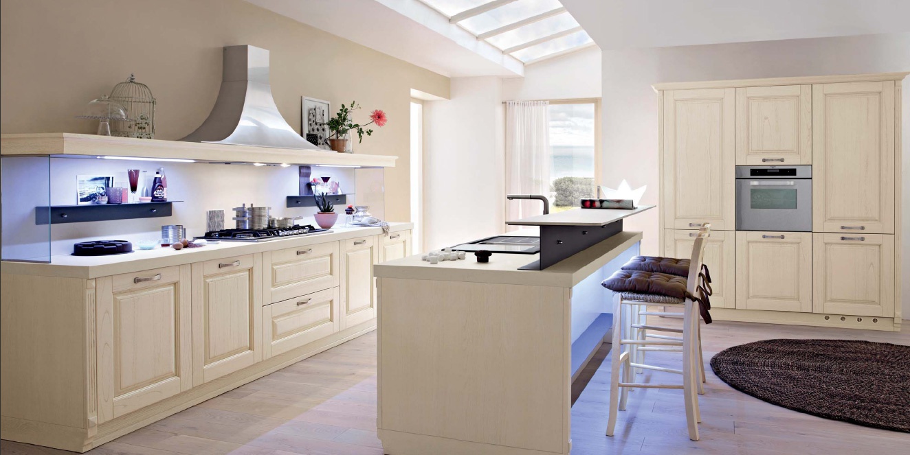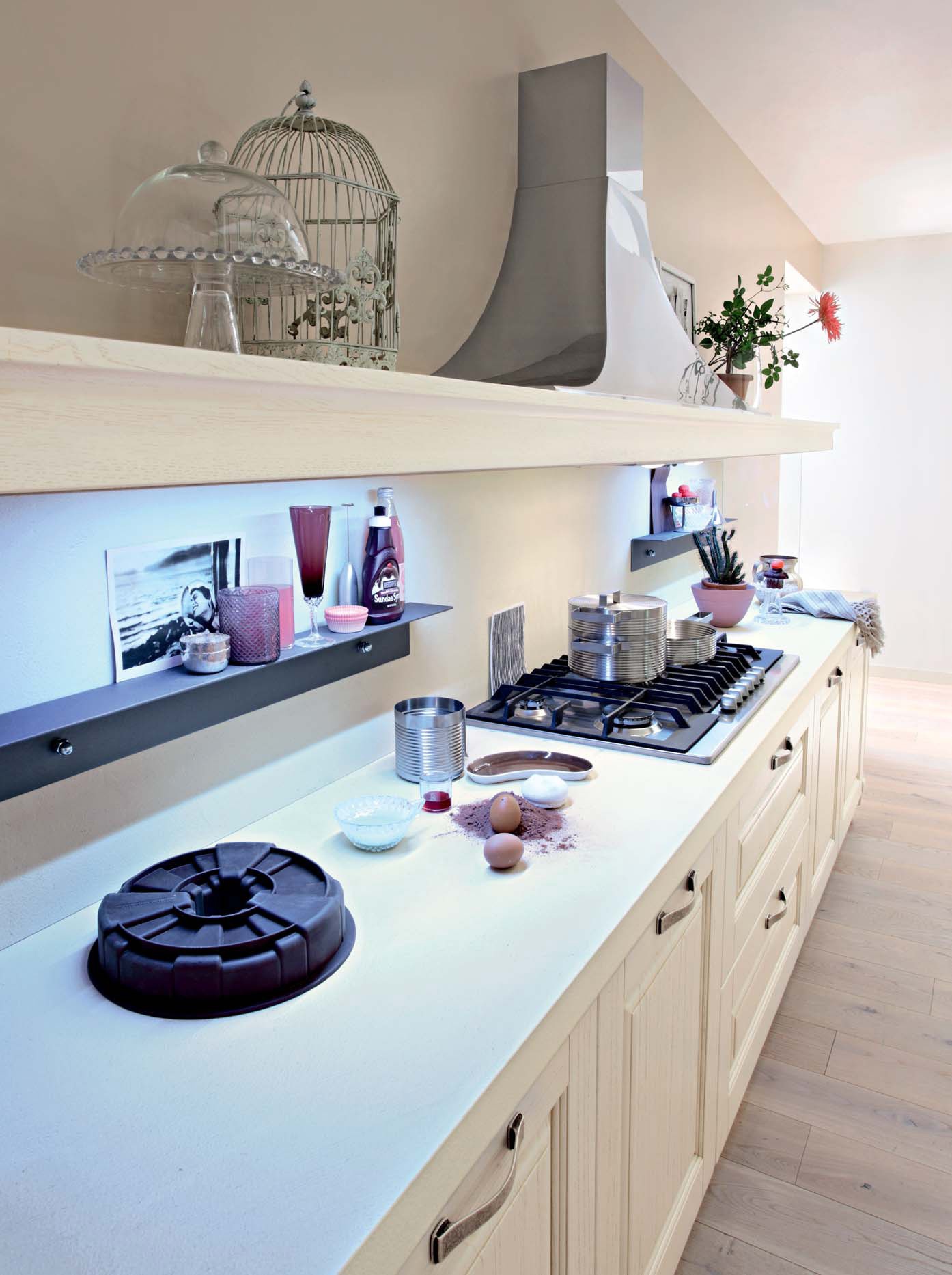 Kitchen Greta comp.1 from the Italian manufacturer Ar-Tre. Structure made of water-repellent wood. Facades made of solid wood in white color with antique finish and visible structure, handle steel aged. Countertop made of artificial stone. Built-in appliances. Colors to choose from manufacturer's catalogue. Kitchen space divided into zones: a place for cooking, storing and relaxing. Functional and customized solution for your kitchen in a classic style.