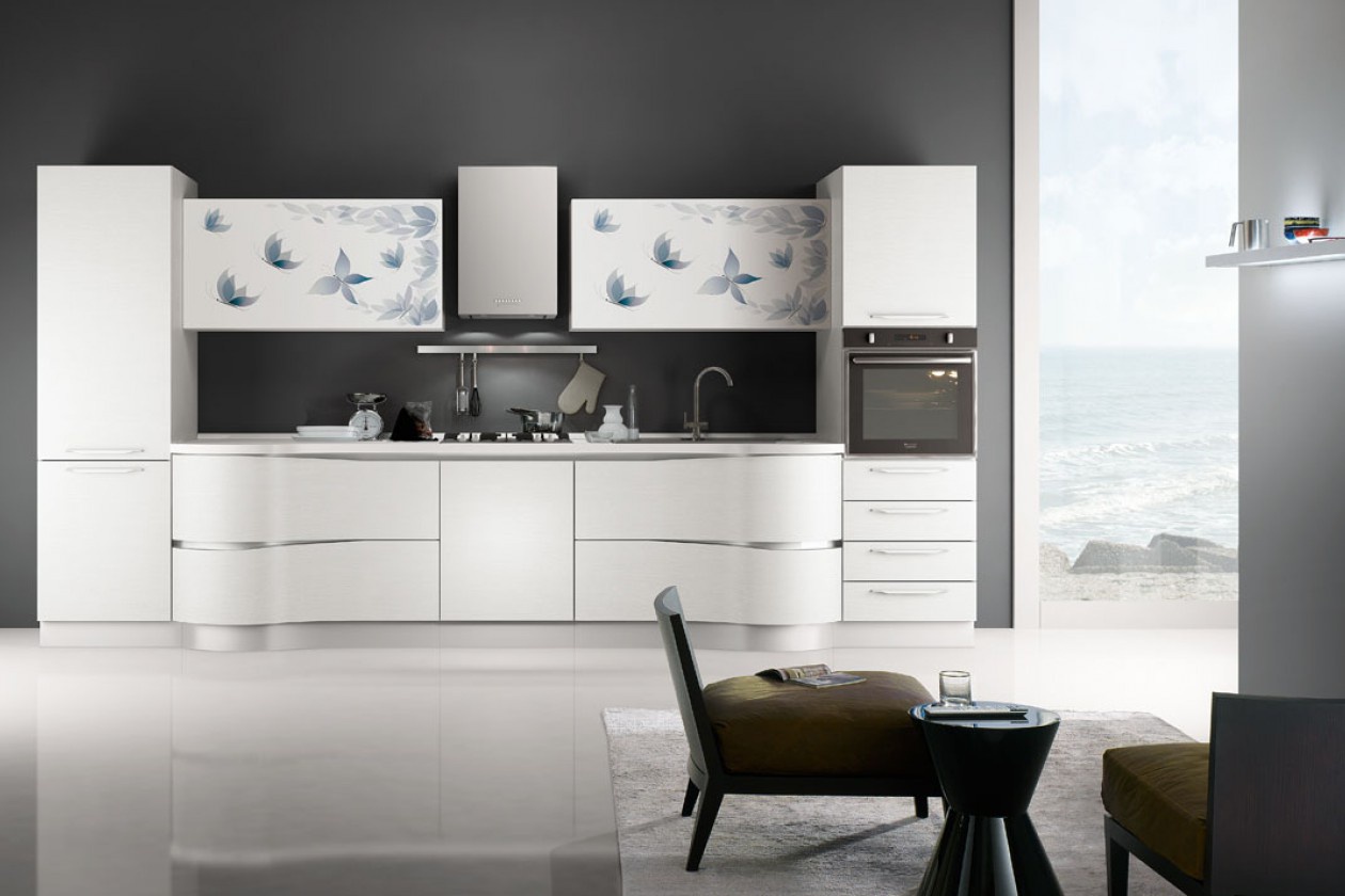 Finish the side walls and fronts white lacquer. Wall cabinets with glass with decorative pattern. Fittings of chromed steel. The highlight of this model - figured curved facades. Possible finishes: veneer of natural wood, different textures and shades. The furniture is made to order. Equipment according to the customer.