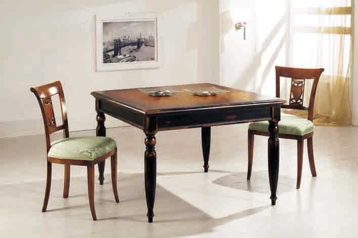 Nerone dining table from Italian manufacturer Arve Style. Table with square top, folding, made of solid wood. Finish - wood veneer from valuable breeds of a tree. Coating - gloss varnish. Product in a classic style, decorated with sculpted legs. Excellent choice for classic dining room and living room.