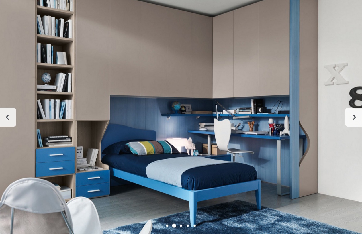 Children's room (Suite for children) Tag 12-14 from the Italian manufacturer Siloma in a modern style. Perfect room for a teenage boy in blue and beige tones. The angular composition of the cabinets creates not only storage space, but also designed in such a way that allows you to embed a bed and a Desk.