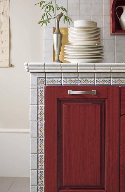 Kitchen Vittoria comp.2 from the Italian manufacturer Ar-Tre. Structure made of water-repellent wood. The facades in the decoration of lacquer red "Borgogna" color and frosted glass, decorated handles made of metal. The table-top working area and the island is made of ceramic tiles with a decorative pattern. Colors to choose from manufacturer's catalogue. The combination of elegant design and carefully selected materials allow to create intelligent solutions that combine aesthetics and functionality of interior space. A classic solution for Your kitchen.
