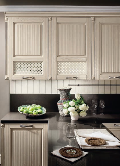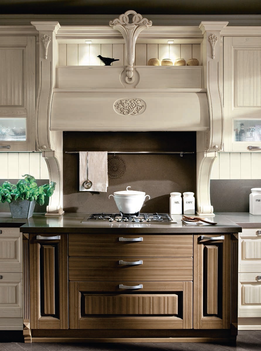 Kitchen Vittoria comp.3 from the Italian manufacturer Ar-Tre. The structure of the kitchen made of waterproof wood. Fronts made of solid walnut finish brown varnish and white with aging effect, open pore and glass with a decorative pattern, metal handle. Countertop made of artificial stone. Colors to choose from manufacturer's catalogue. Built-in appliances. This configuration erases all the stereotypes in the construction of the kitchen, combining kitchen and living areas together. The rich detail, modern inner filling and lighting of working area - increase the functionality of the kitchen. Classical style of singing.